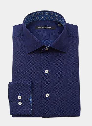 The Thoresen shirt showcases European craftsmanship at its finest, constructed from premium cotton that delivers both comfort and durability. Navy blue fabric forms the elegant base, while distinctive blue medallion contrasting details on the inner cuff and collar add a refined touch of personality. This versatile button-down seamlessly transitions from boardroom to weekend, embodying understated sophistication for the modern gentleman.