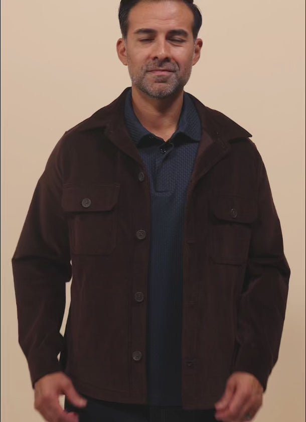 Discover effortless sophistication with the Glasgow Velvet Stretch Overshirt in dark brown, a versatile layering essential that works beautifully over any shirt. The plush velvet fabric features a gentle stretch that moves with you, while dual chest pockets and side pockets keep your essentials within reach. Thoughtfully crafted with attention to detail, this piece supports your personal style with texture and substance.