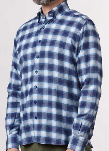 Introducing the Kimball button-down flannel, crafted with high-quality Italian flannel. The stunning blue plaid design is complemented by blue contrast fabric, adding a touch of sophistication. Italian Fabric