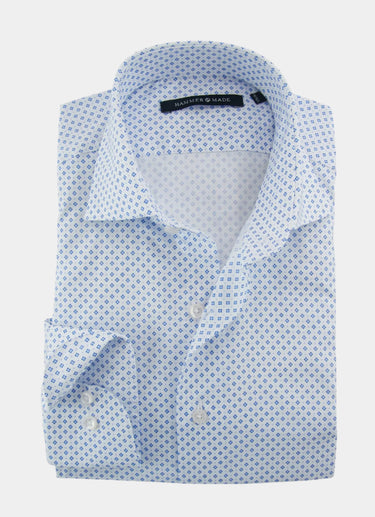 Expertly designed for a polished and modern look, Correll features a crisp white fabric with a striking geometric print in a soothing blue tone. Perfect for any occasion, this shirt effortlessly combines style and versatility for a confident and sophisticated appearance.