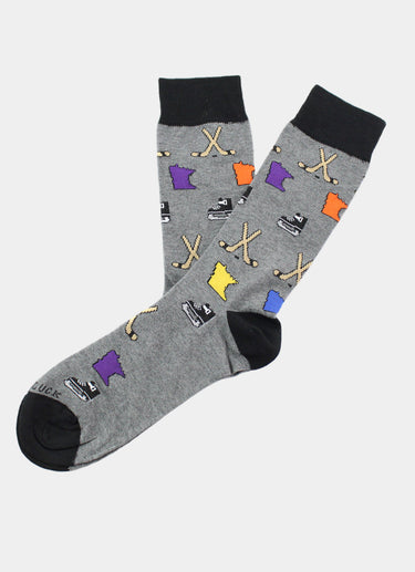 Get ready to score some goals with Puck Luck Sock! These quirky Minnesota state hockey socks will have you feeling like a true MVP on the ice. Perfect for any hockey fan, these socks add a touch of fun to your game. (Slip them on and get ready to lace up those skates!)