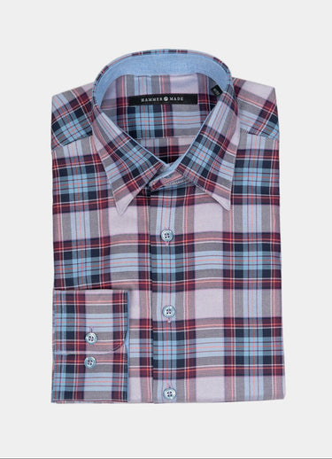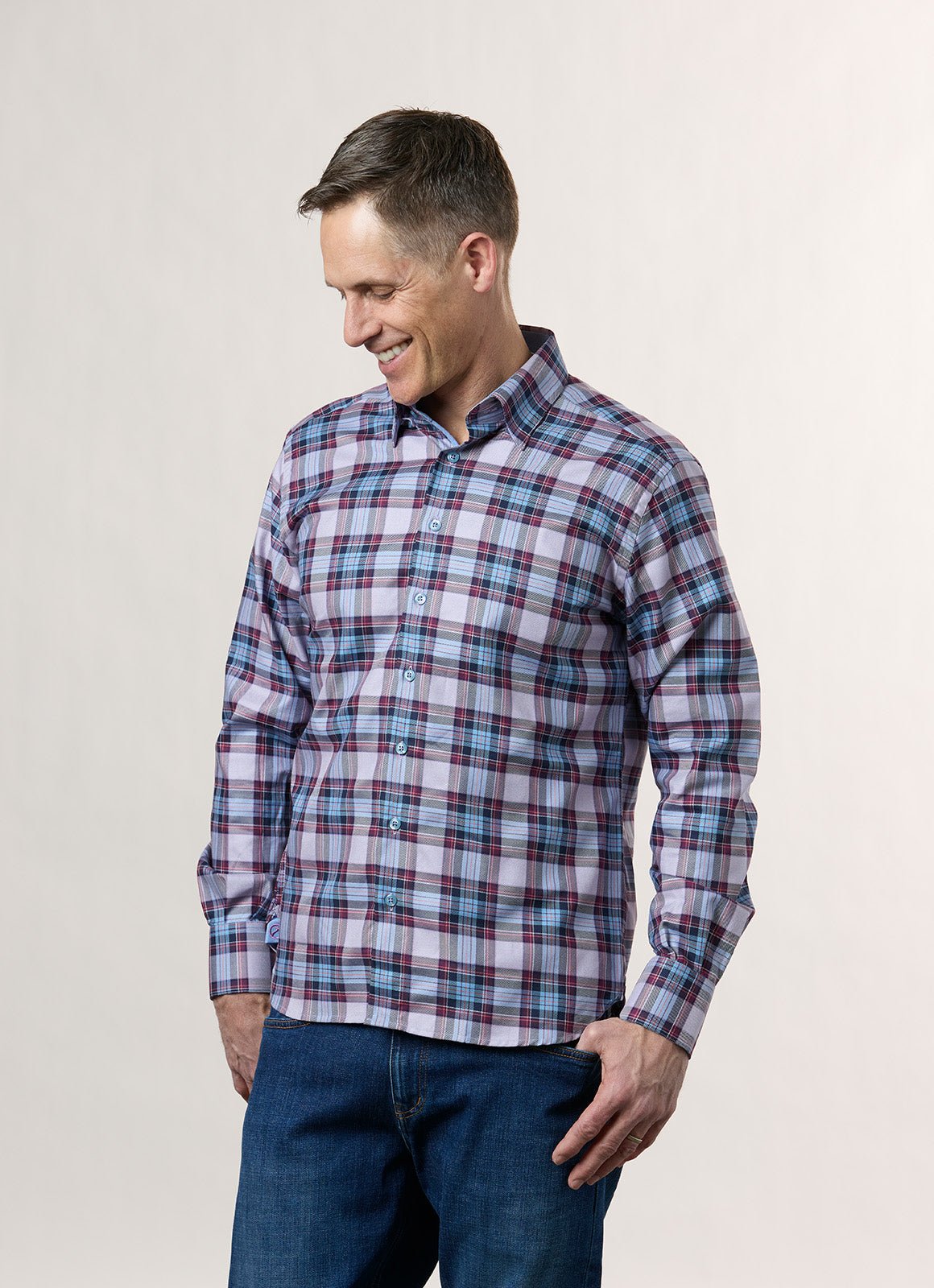 Introducing Townsend, the perfect addition to your wardrobe. This purple multi-colored plaid top features a spread collar highlighted with blue accents on the inside of the collar and cuffs. Elevate your style with Townsend's unique design and versatility.