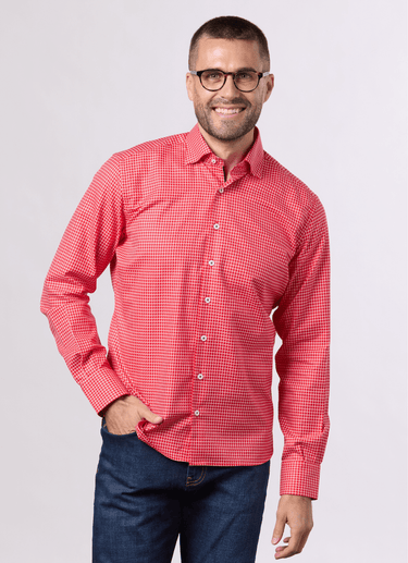 The Wozniak is a bold and stylish ginham shirt available in tailored and slim fit options. Its stunning red color with white accents make it perfect for the upcoming holiday season. Stand out in any room and exude confidence with this must-have shirt.
