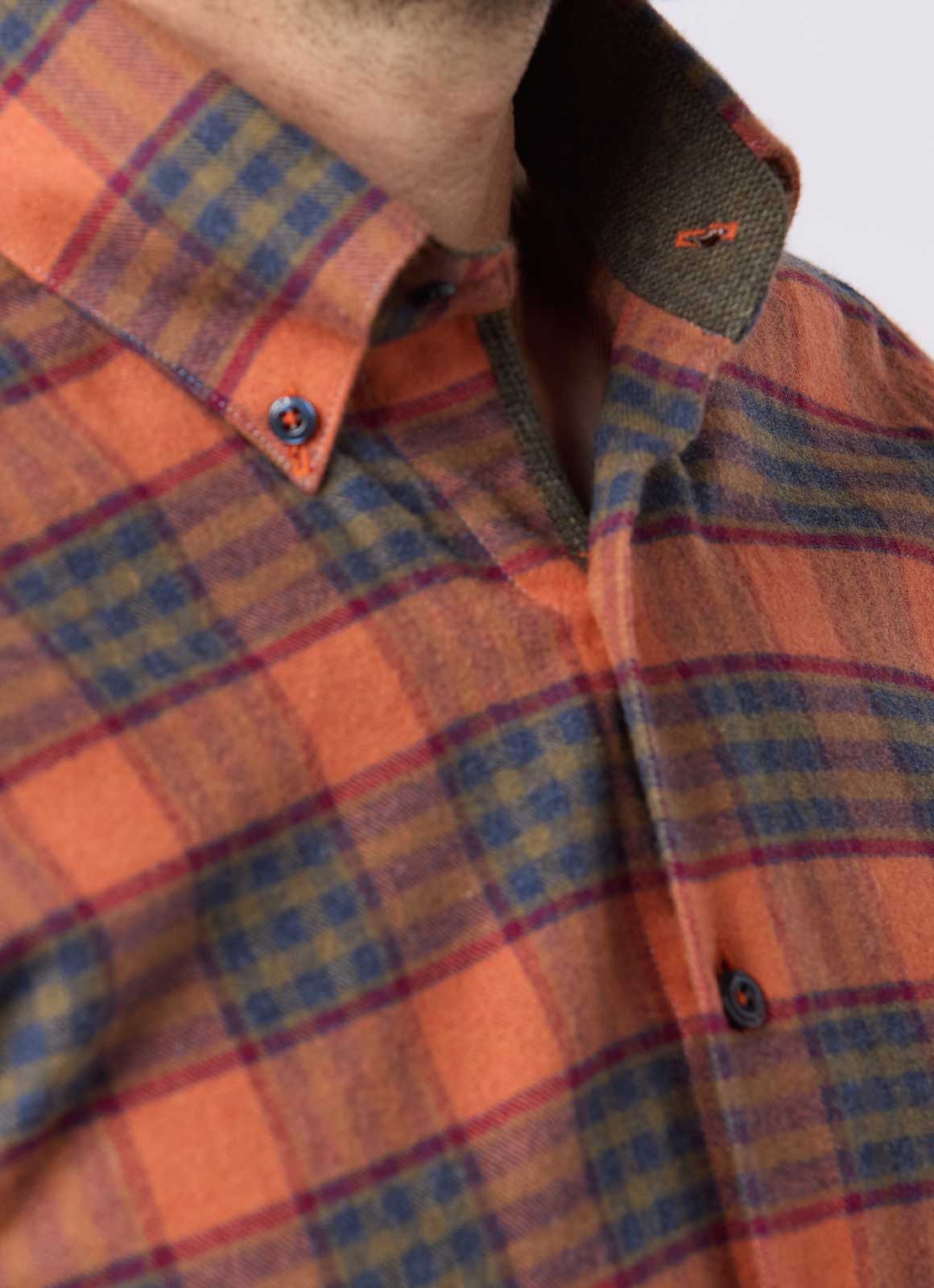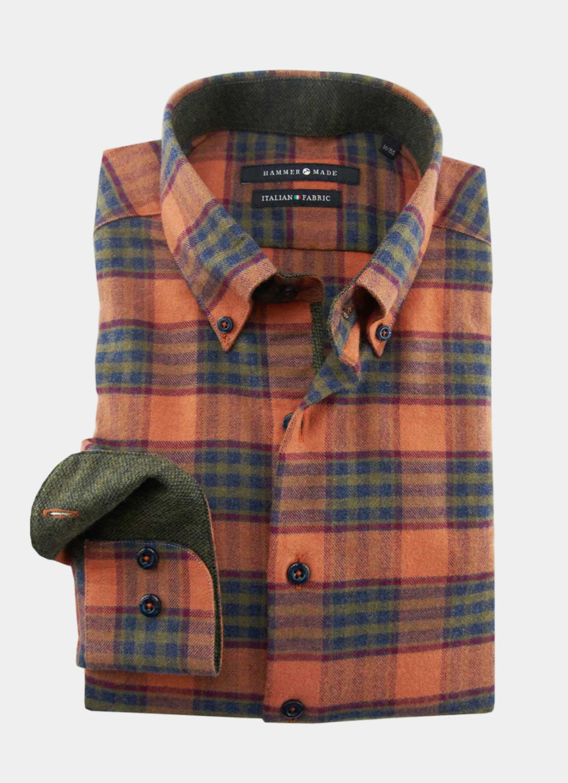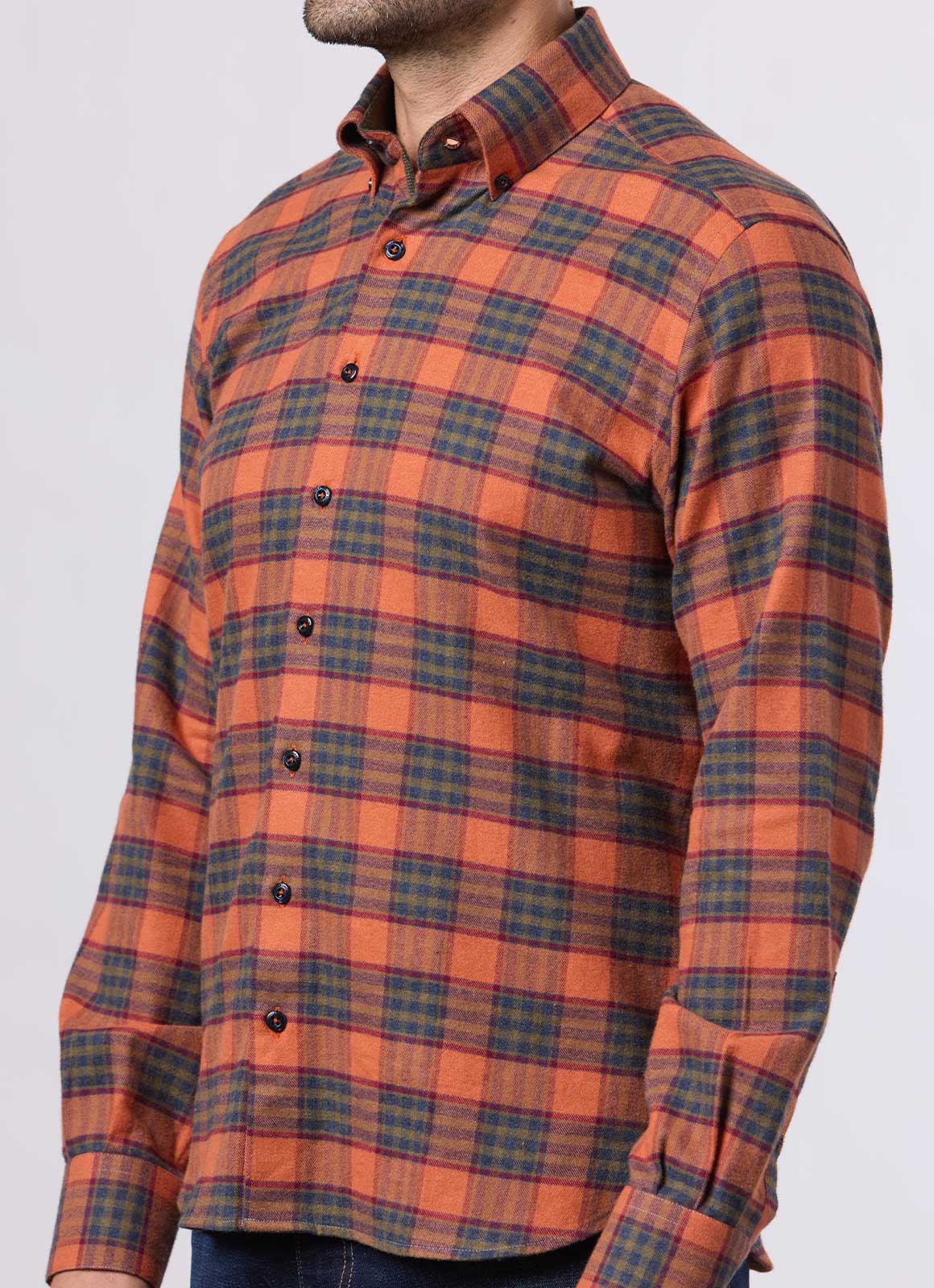 The Hammond button down shirt is expertly crafted from premium Italian fabric, featuring a vibrant orange and neutral toned flannel design. The textured olive accents add a touch of sophistication. Elevate your wardrobe with this high-quality, stylish shirt.