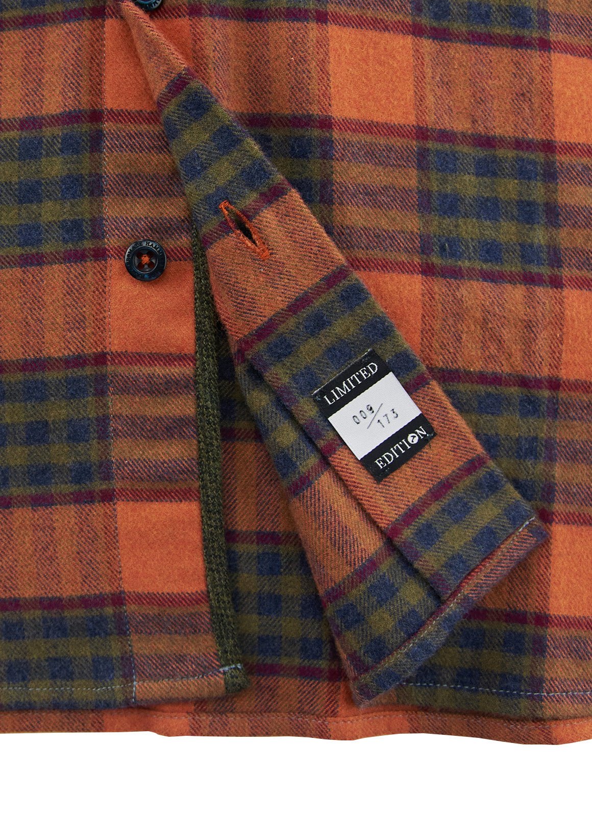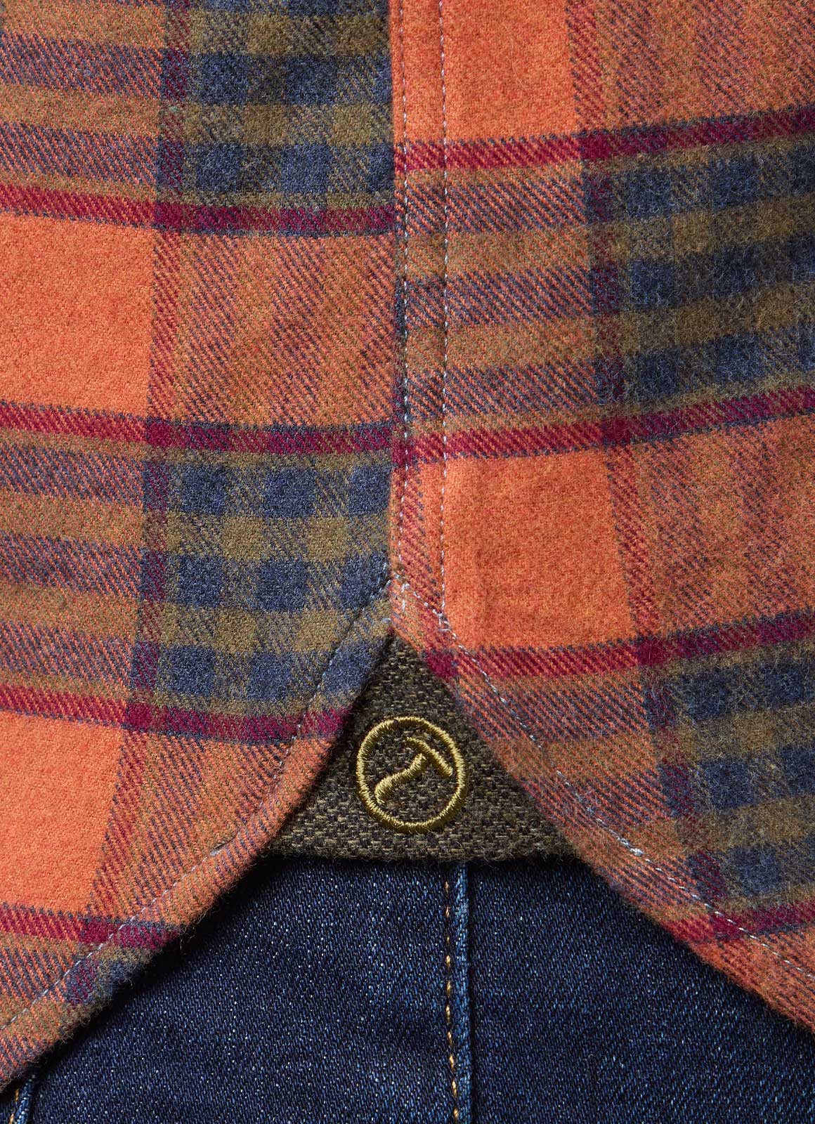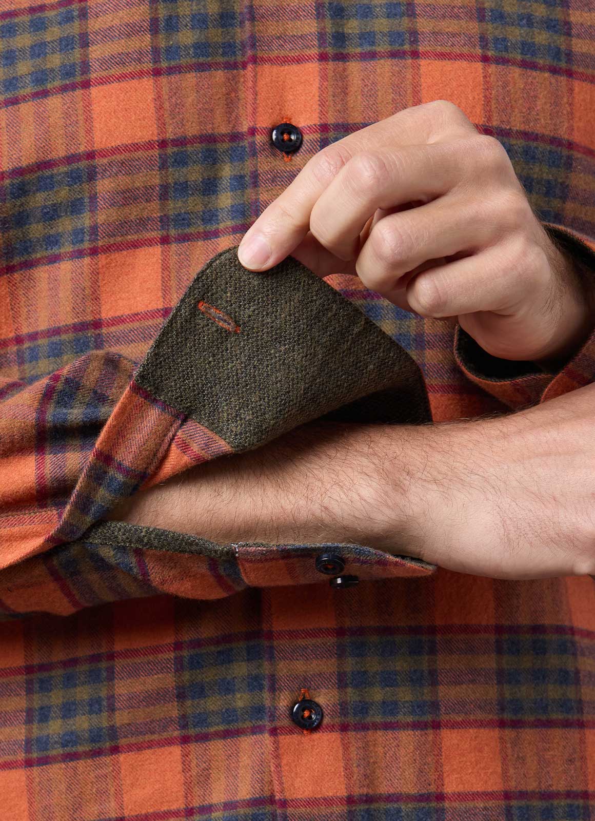 The Hammond button down shirt is expertly crafted from premium Italian fabric, featuring a vibrant orange and neutral toned flannel design. The textured olive accents add a touch of sophistication. Elevate your wardrobe with this high-quality, stylish shirt.