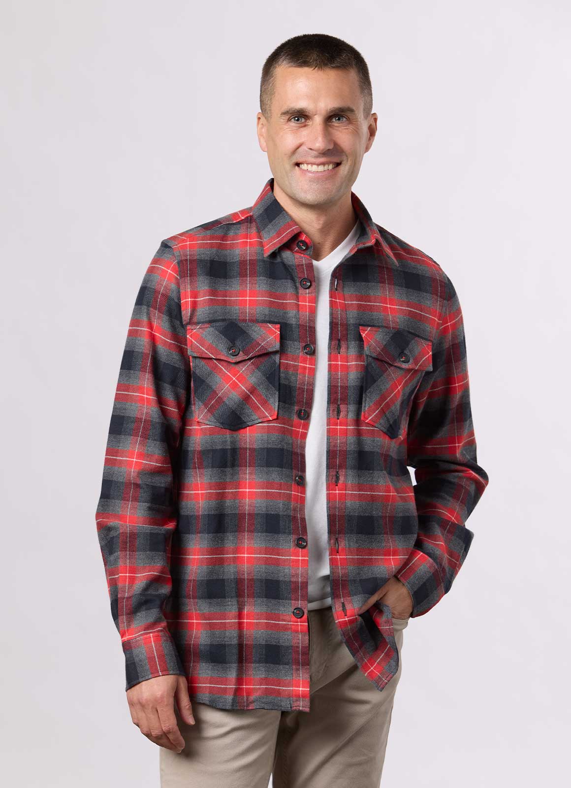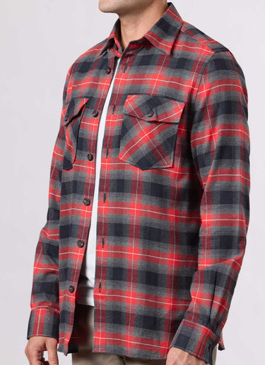 Hollandale is a stylish button up over shirt made from high-quality Italian fabric. Its striking red and grey plaid design adds a touch of sophistication to any outfit. Crafted with expert craftsmanship, this shirt offers both comfort and style.