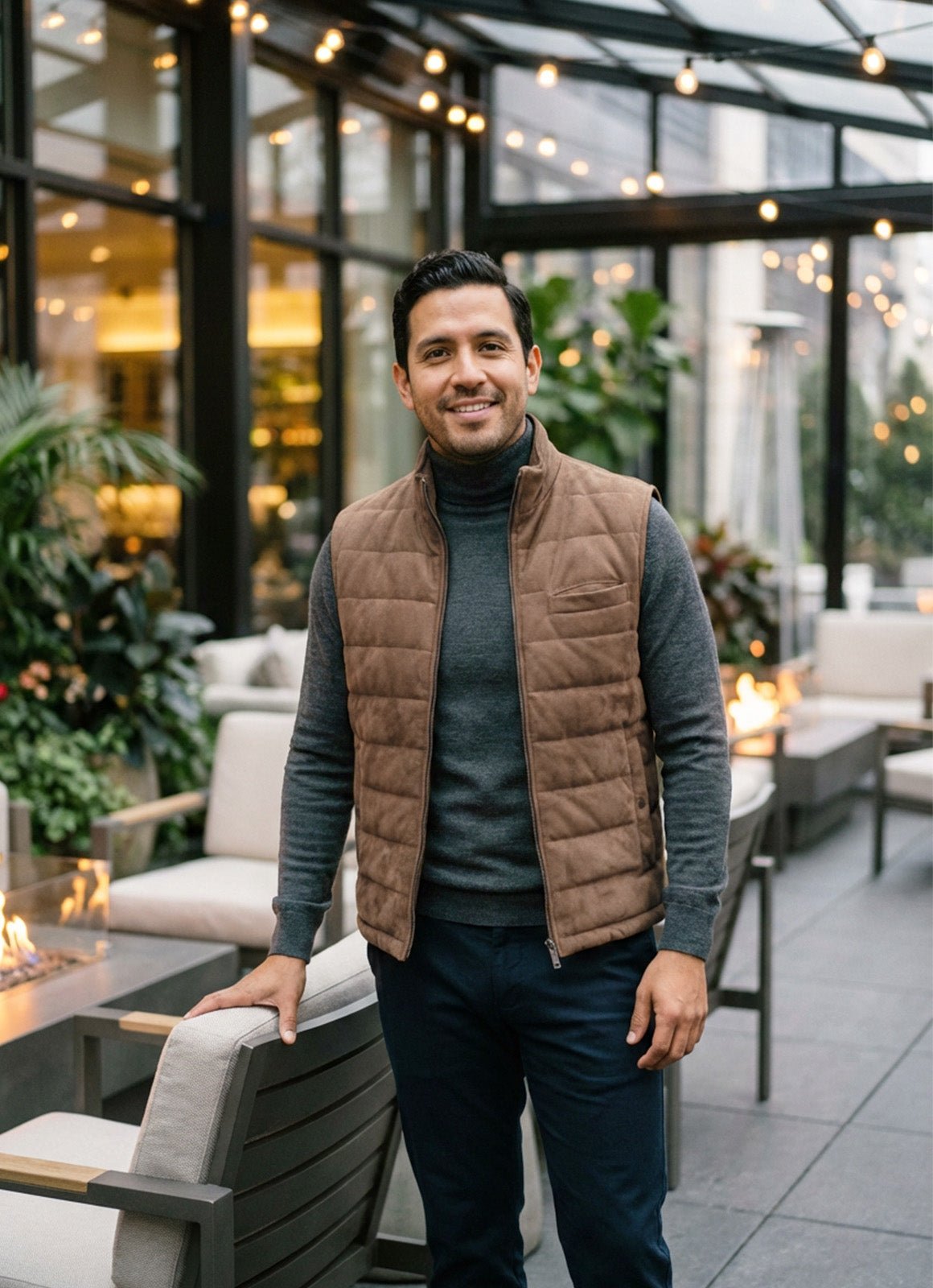 The Khaki Briggs Vegan Suede Vest brings European craftsmanship to your seasonal wardrobe, offering a sophisticated layering piece that works beautifully for sophisticated gatherings and everyday elegance. Discover the thoughtful details within—a striking contrasting pattern lines the inside, adding personality and visual interest every time you move.
