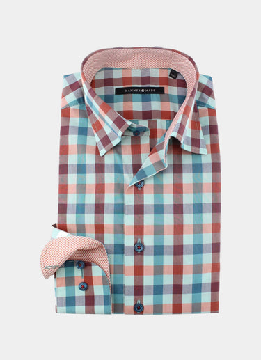 Experience the sophisticated style of the Gavarrete button up shirt. Its red and teal plaid design is elevated by the textured orange contrast fabric. Perfect for adding a pop of color to any outfit.