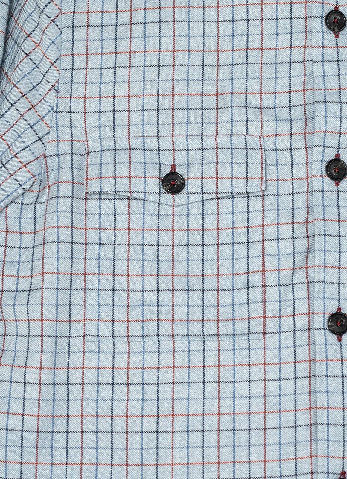 - Double chest pockets; trim detail inside back of collar, cuffs