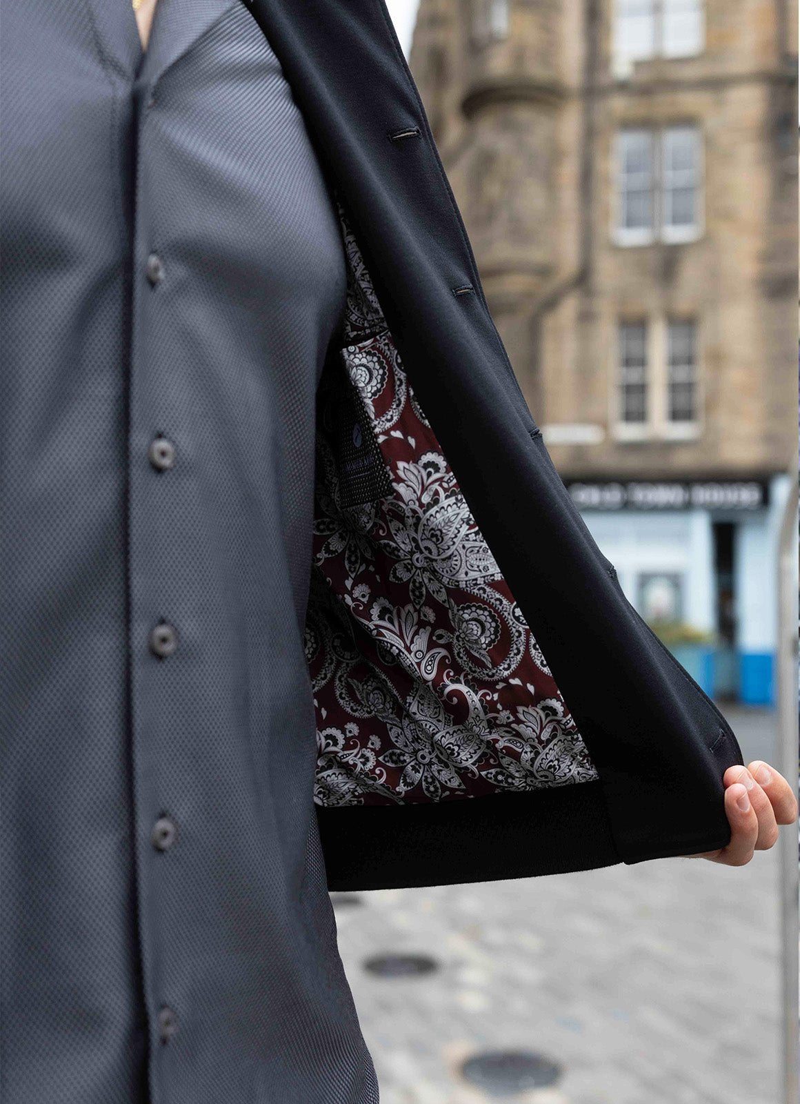 Made with modern style and expert craftsmanship, the Tofte Bomber Jacket is a must-have for any fashion-forward wardrobe. The sleek black exterior is accented by bold black buttons and a vibrant red and white paisley interior, providing both warmth and a pop of color.