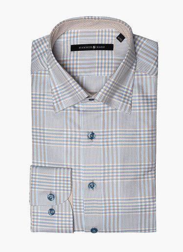 Discover the Calvin, sibling to Royal Duke & Foss. This shirt showcases a hidden button-down collar, and sophisticated blue and beige plaid pattern with tan accents on the placket, inner collar and cuffs. Crafted to seamlessly blend sophistication with versatility, the Calvin is perfect for enhancing both business and casual ensembles. Its thoughtful details and refined style make it a standout piece for those seeking understated elegance in their wardrobe.