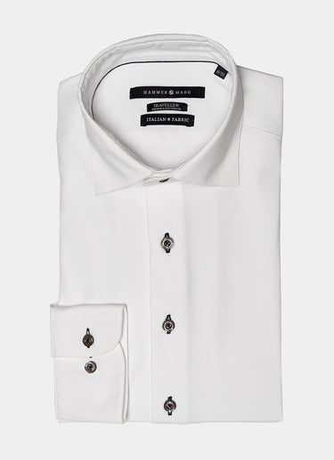 Transform your wardrobe with the Harmon long sleeve shirt. The button up collar and stretch fabric provide both style and comfort, while the wrinkle resistant material ensures a lasting crisp look. The classic white is accented with a pop of black piping on the inside placket and collar, adding a touch of personality to any outfit.