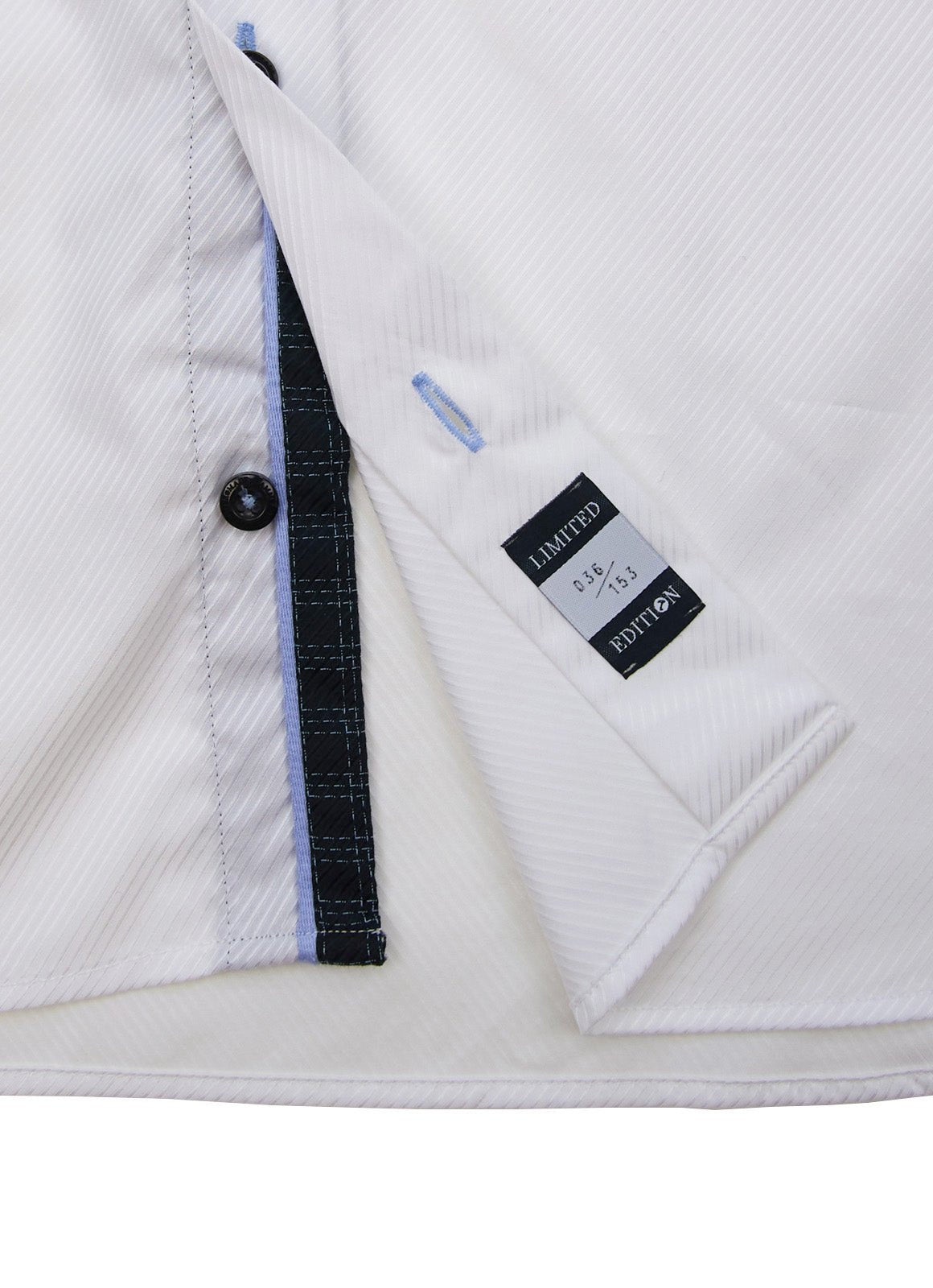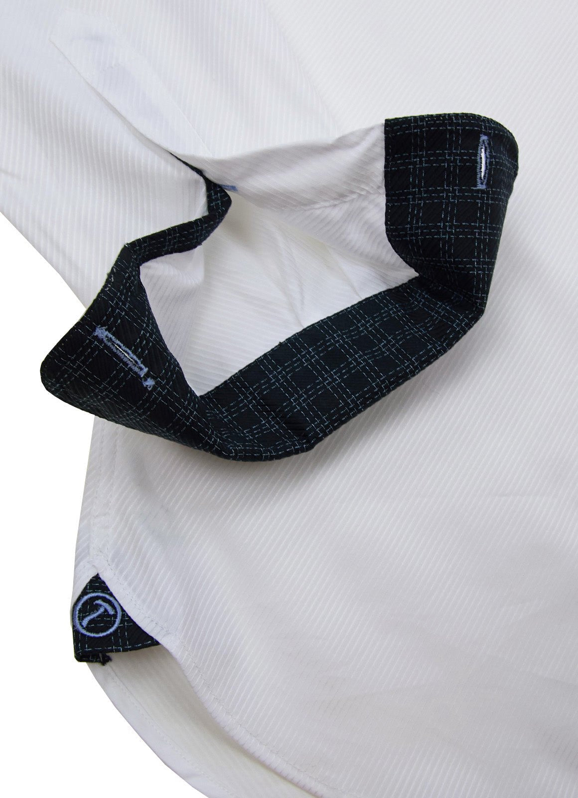 Mae is a timeless white button-down shirt featuring a refined black and blue grid pattern on the placket, inner collar, and cuffs, adding subtle sophistication. Mae is the perfect wardrobe staple to help you look and feel confident in any business or workplace setting.