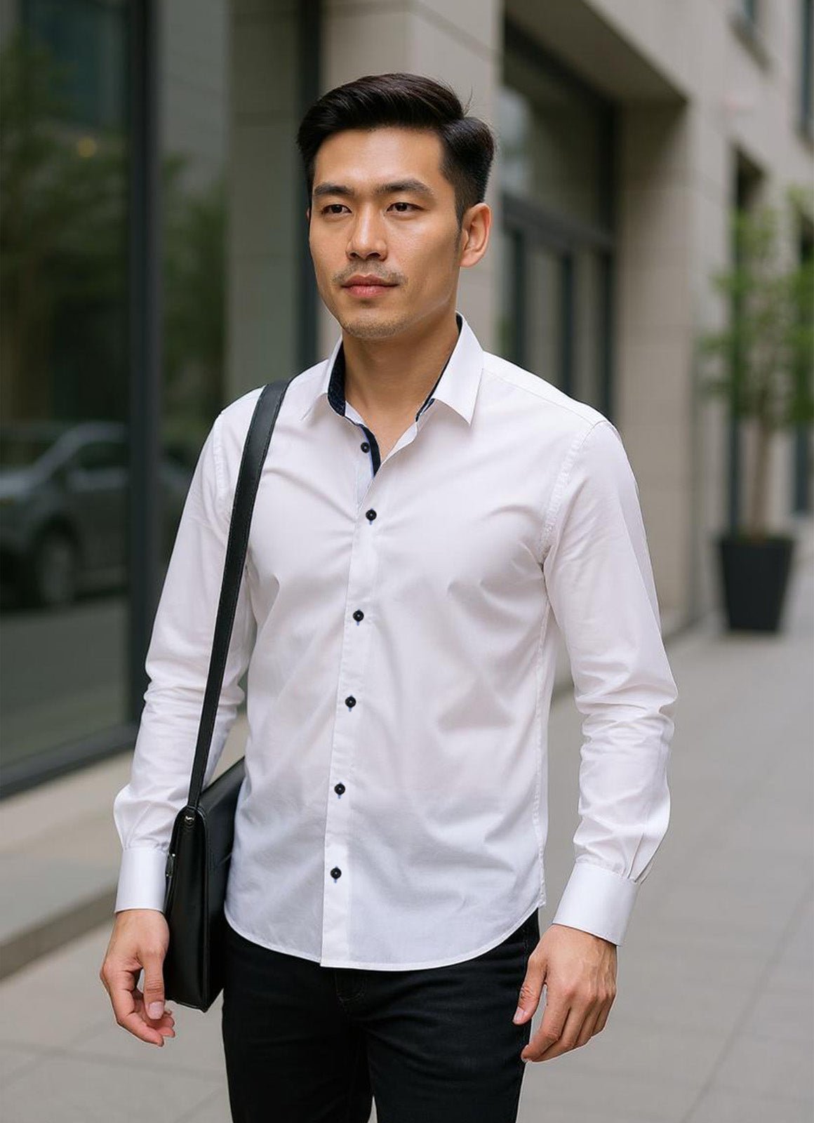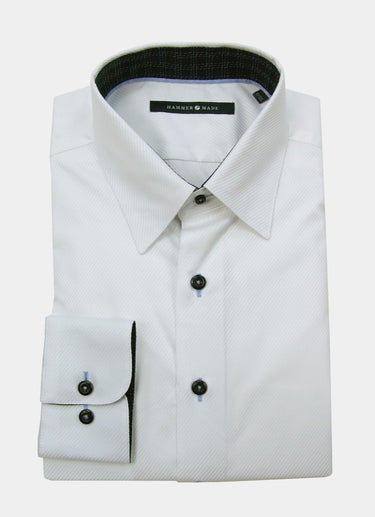 - Accent spread collar, trim & inside cuff