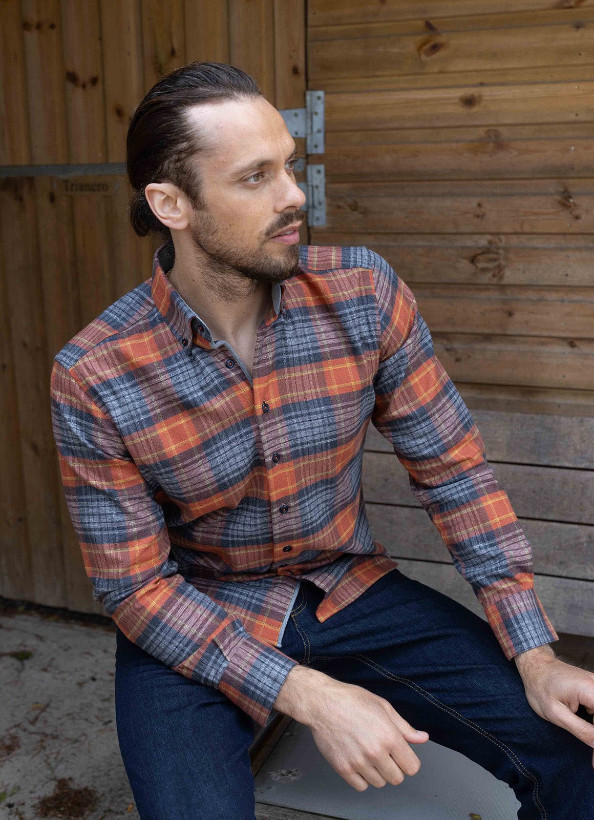Upgrade your wardrobe with the Maher button down flannel. This flannel features a stylish orange and grey plaid design. Stay warm and comfortable while looking your best in this must-have staple piece.