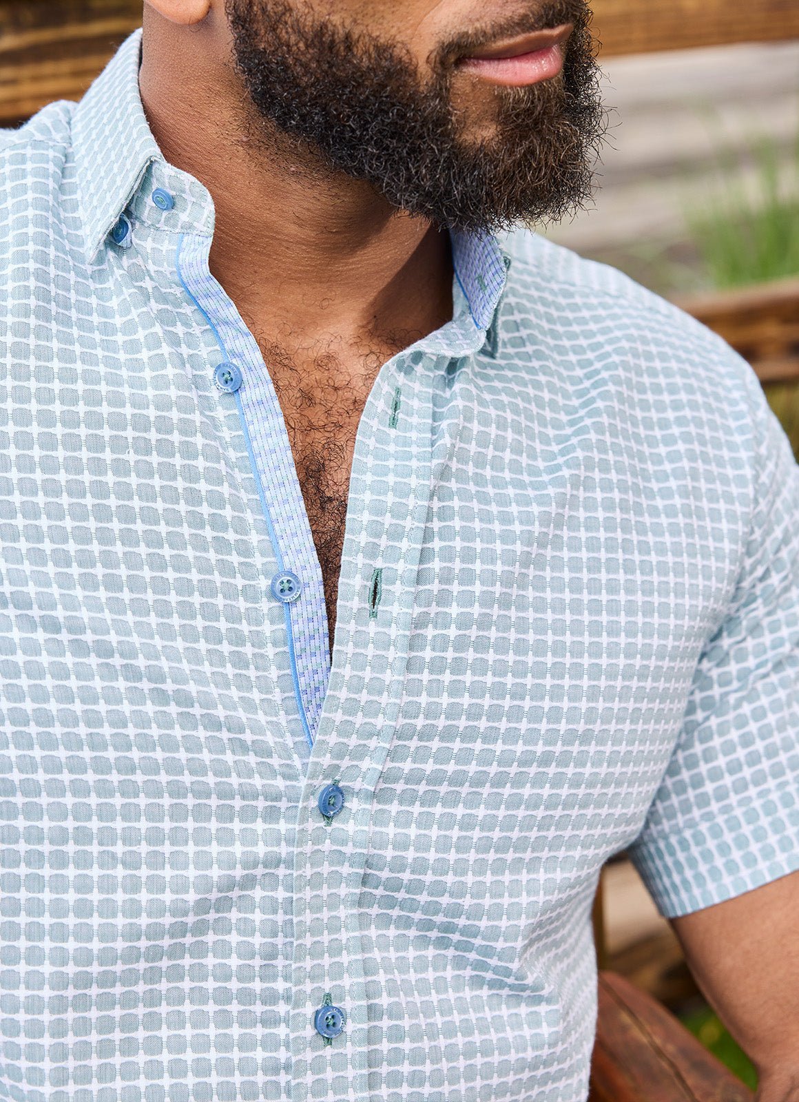 The Buckman features a distinctive grid pattern complemented by a subtle contrasting design on the inner sleeve cuff, all crafted from lightweight, high-quality cotton that ensures lasting comfort and style.