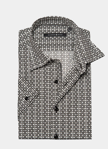 Take on new challenges with Fes! This bold black and white ring print short sleeve shirt will elevate your style and keep you comfortable while you conquer the day. Embrace your adventurous side and stand out in this unique piece.