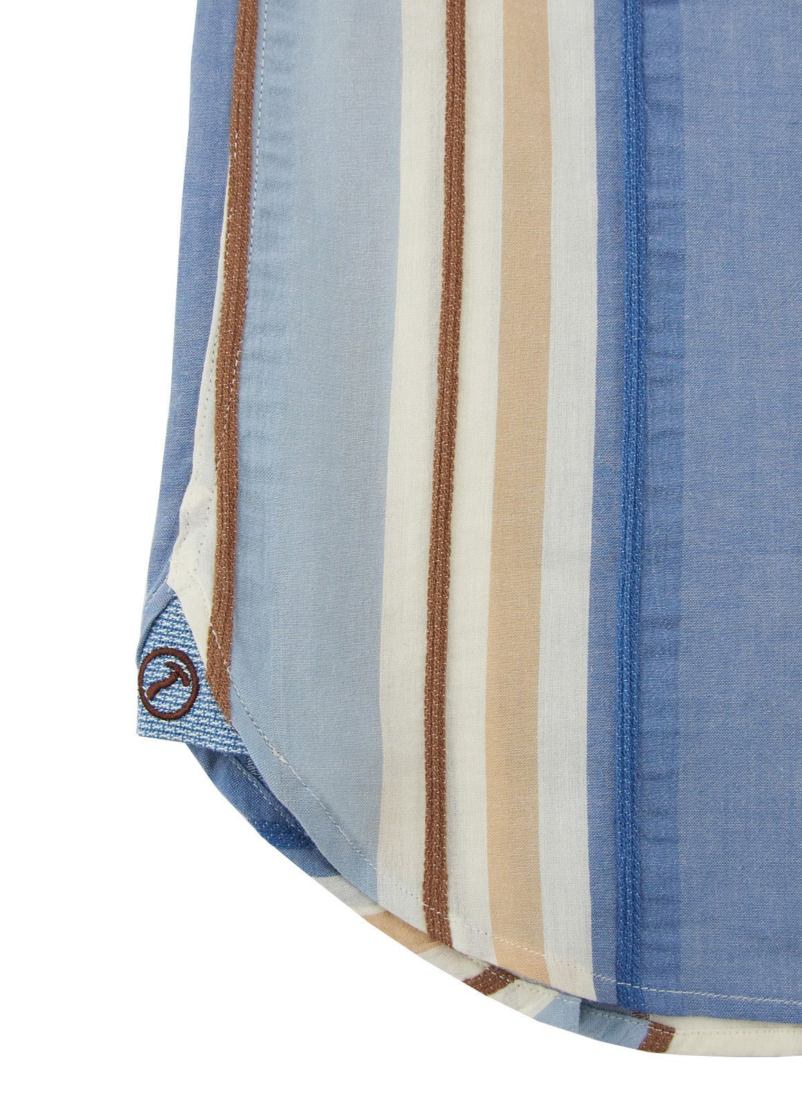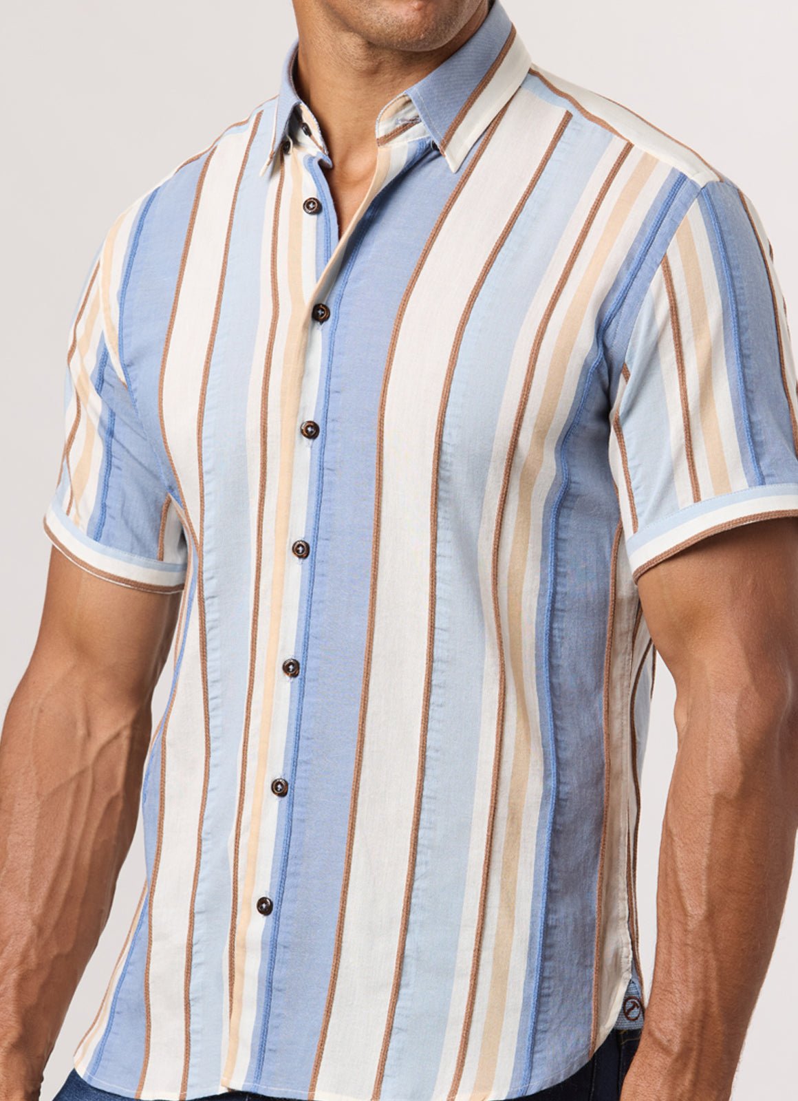 Transform your wardrobe with Normandy. In timeless blue and earth tones, it's accented with brown textured stripes. And for a touch of contrast, we've lined the inside collar and cuff in solid of blue. Elevate your style with Normandy!