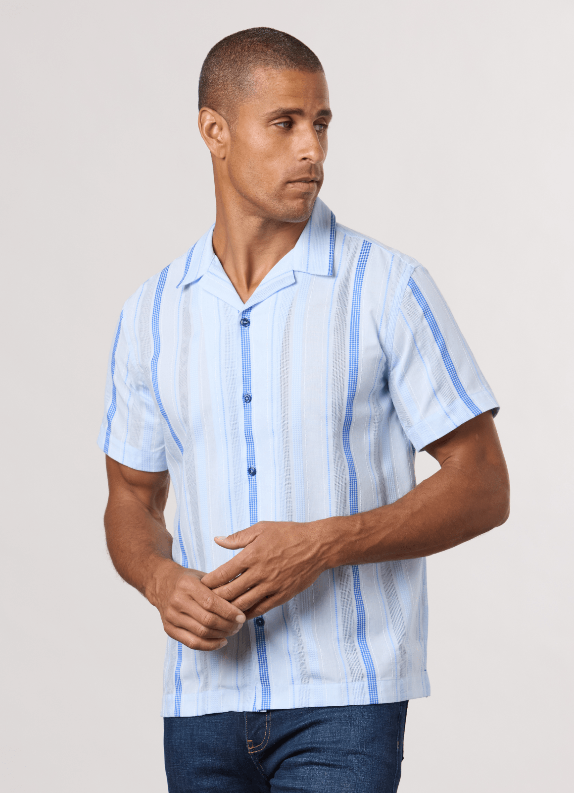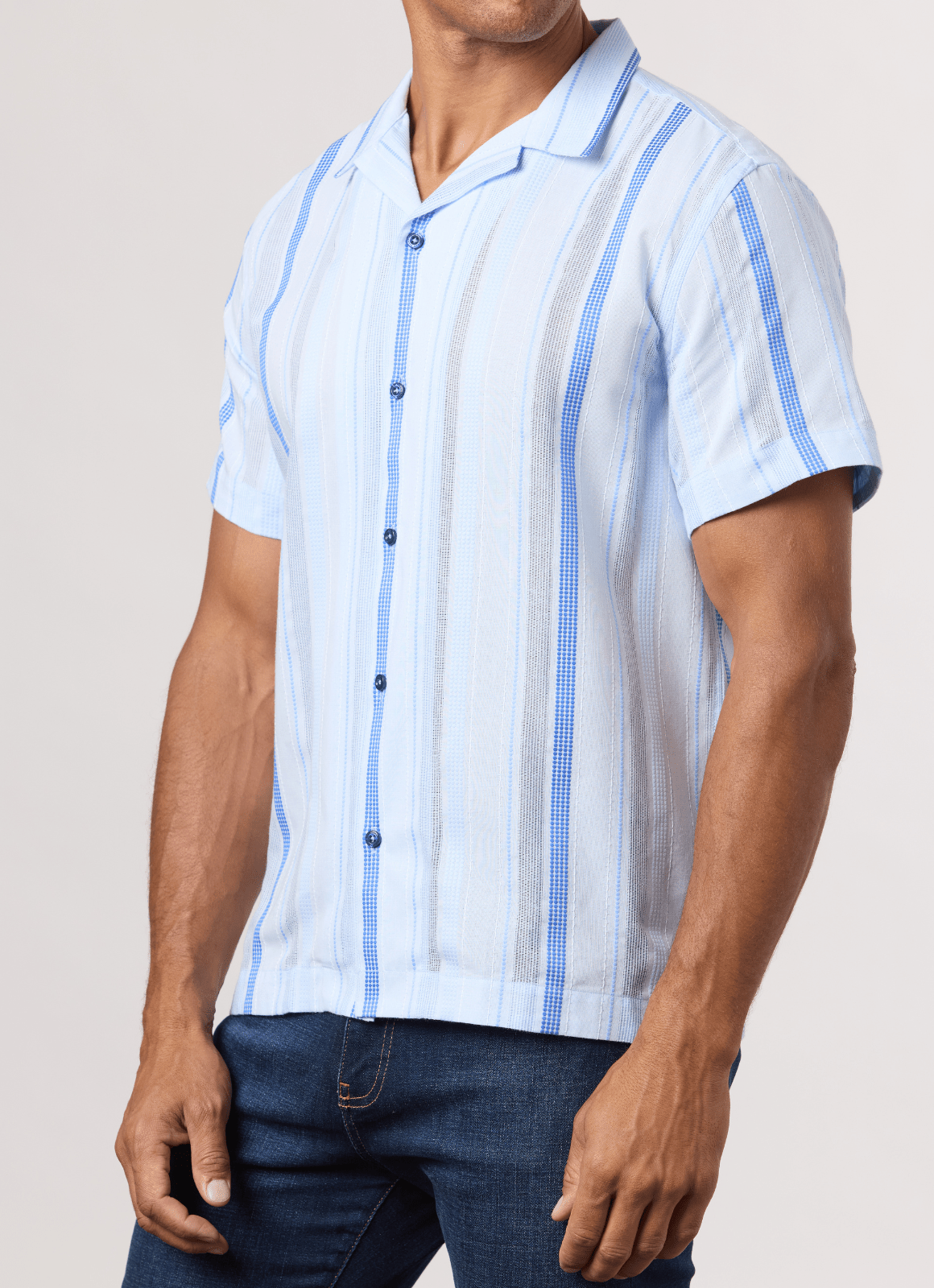 This Oahu light blue short sleeve top with blue stripes is perfect for a casual yet stylish look. Crafted with lightweight fabric, it offers a comfortable fit that is perfect for any occasion.