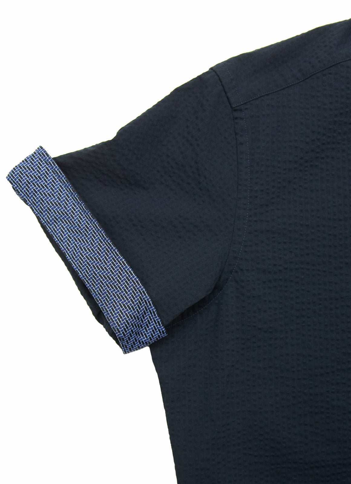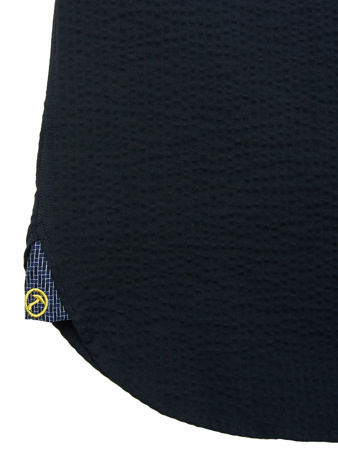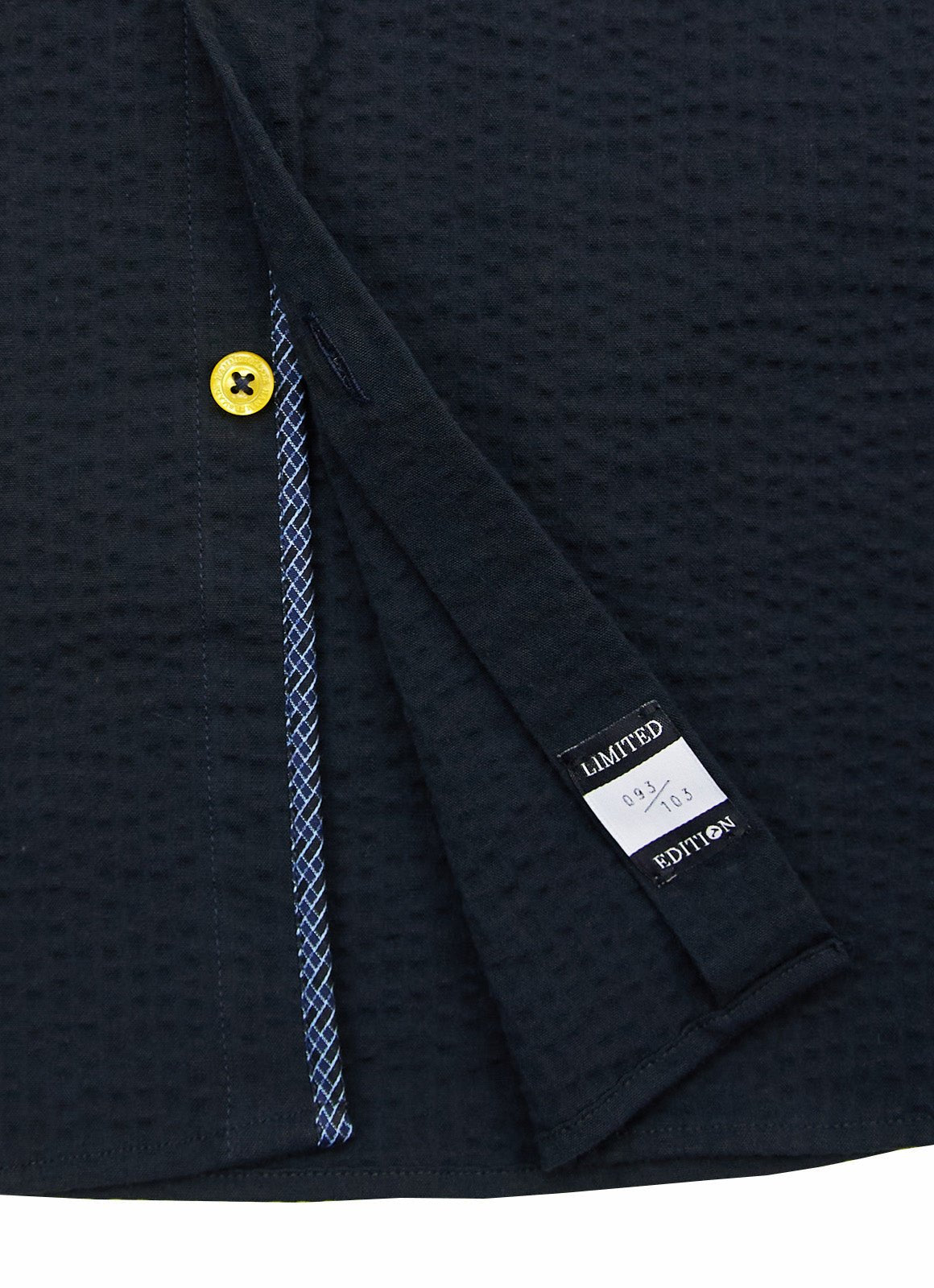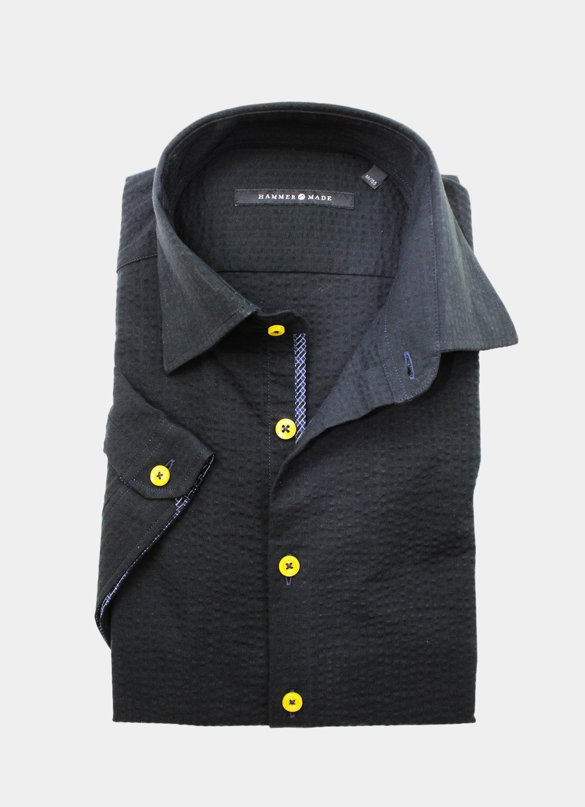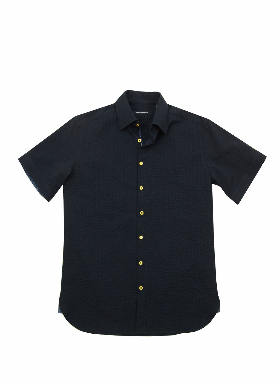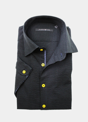 The Cullen short-sleeve shirt reflects European craftsmanship with its sleek black fabric and vibrant yellow buttons for a bold touch. Subtle blue patterns on the inner cuff and placket add a unique detail that enhances its refined design.