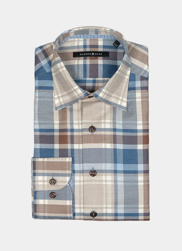 The Alvarado shirt is an elegant essential for every wardrobe, it's plaid pattern in brown and blue makes it an ideal choice for both casual and formal events. The Solano Jacket is a great choice to layer over the Alvarado, providing a refined transition into the fall season.