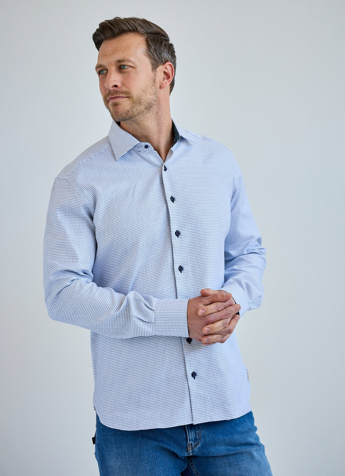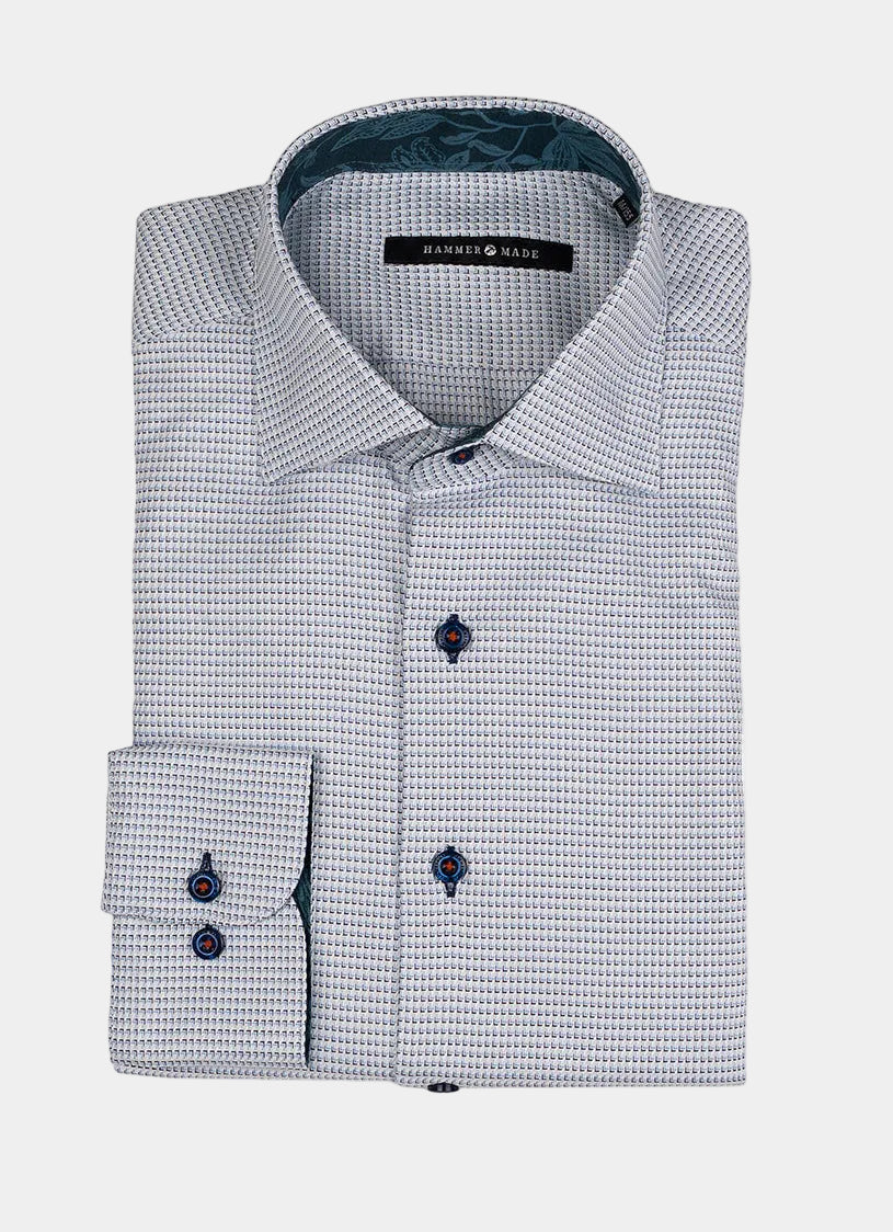 Discover the Brisson, a European-crafted cotton shirt that combines timeless style with meticulous attention to detail. The sophisticated micro pattern offers versatile elegance, while the navy floral accent on the inner cuff and collar reveal the craftsmanship that sets this piece apart. Elevate your wardrobe with a shirt that balances classic design with distinctive European quality.