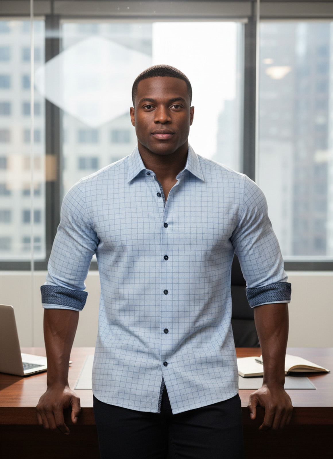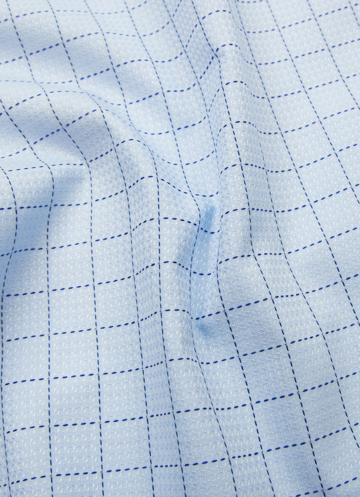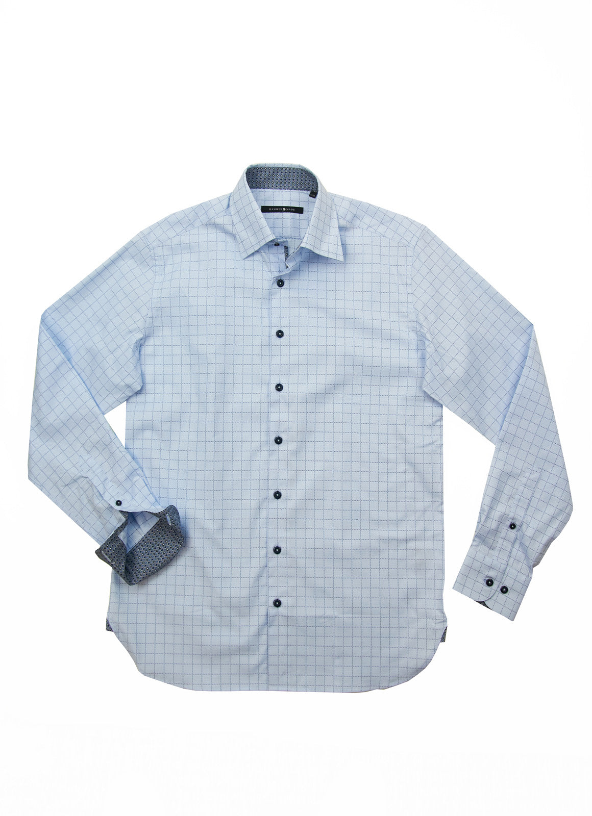 Cushing is a timeless light blue button-down shirt featuring a refined blue grid fabric with a contrasting accent pattern on the placket, inner collar, and cuffs, adding subtle sophistication. Cushing is the perfect wardrobe staple to help you look and feel confident in any business or workplace setting.