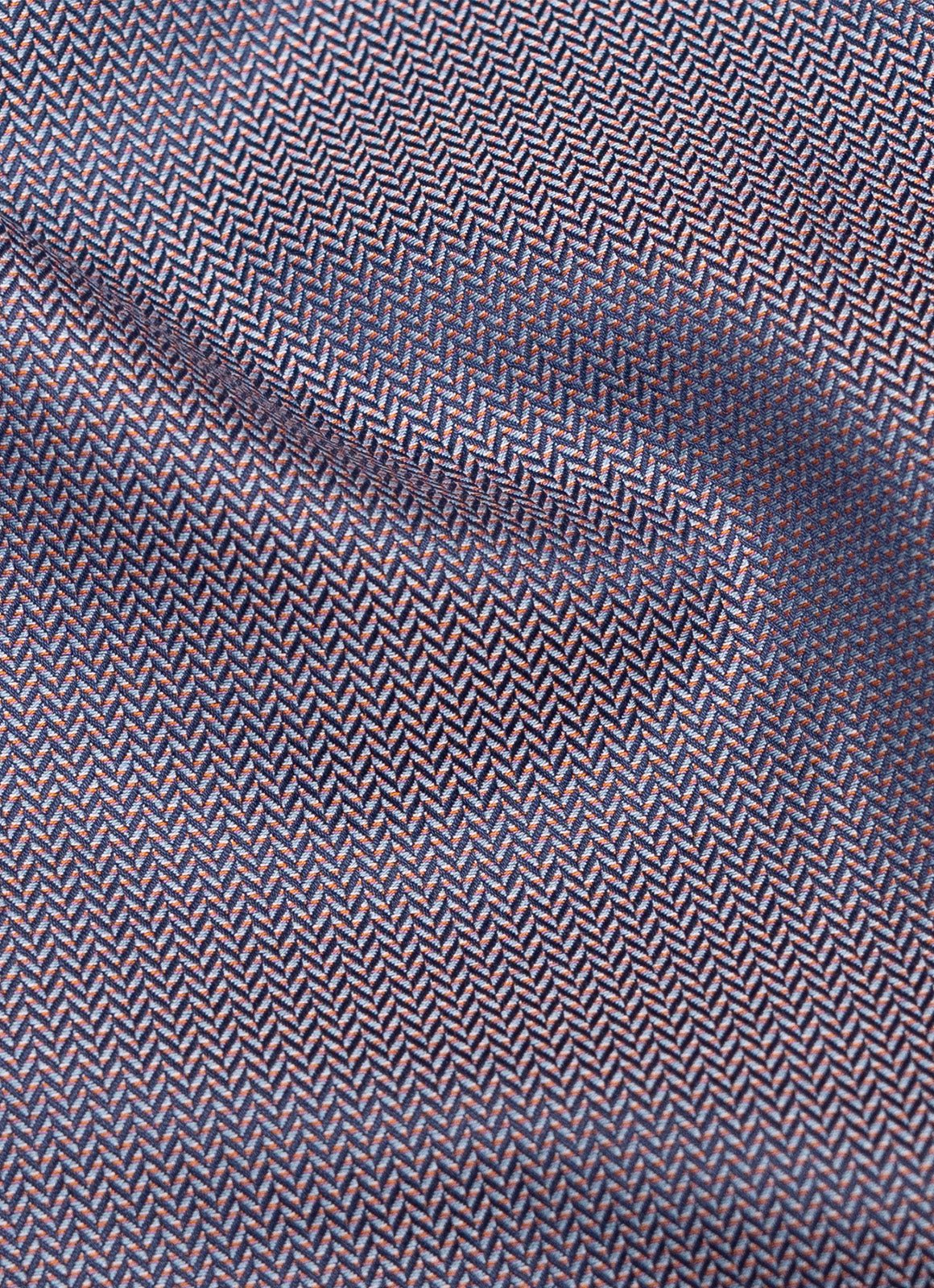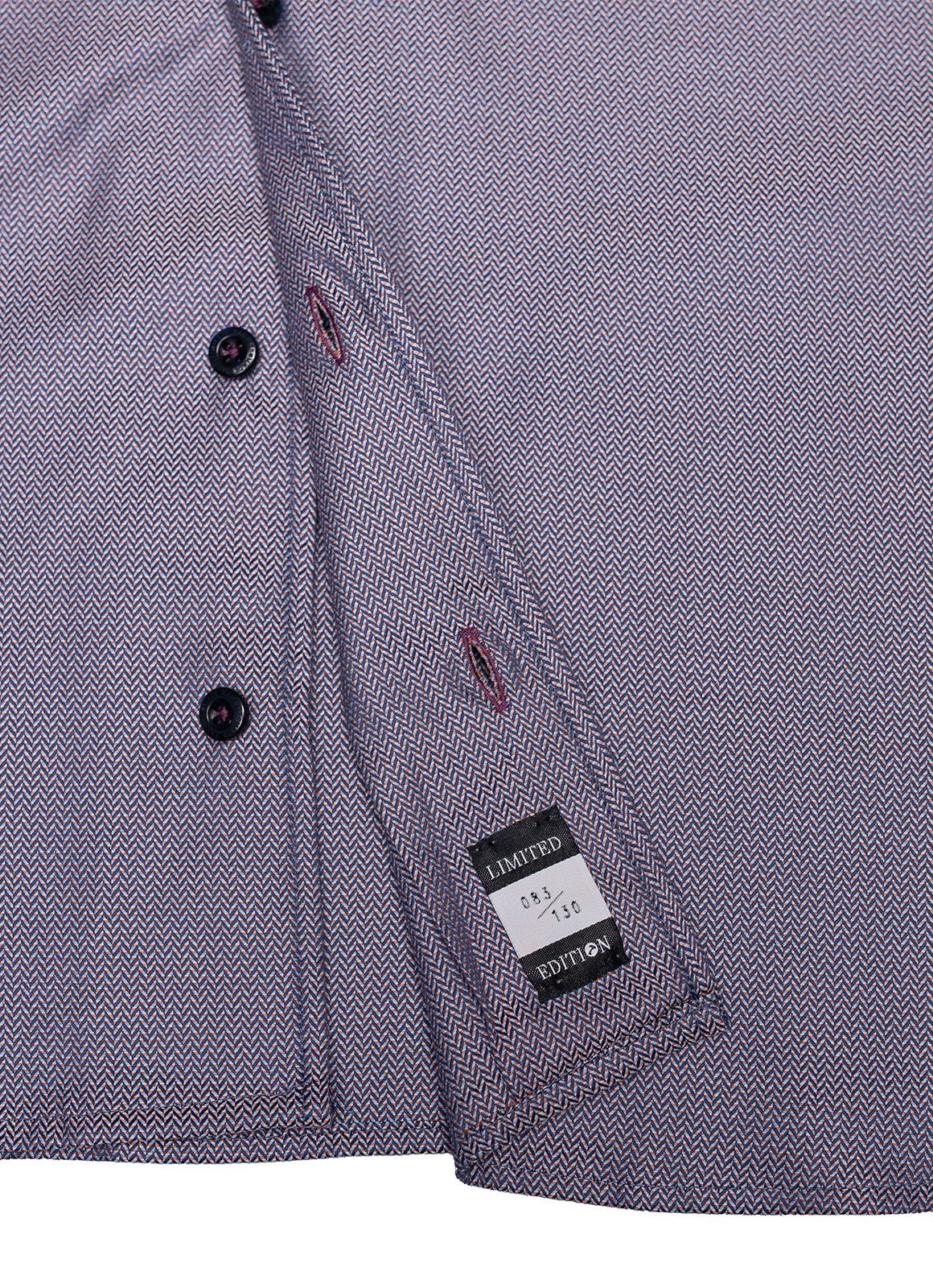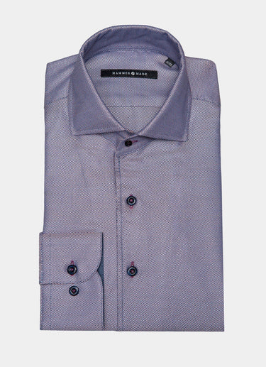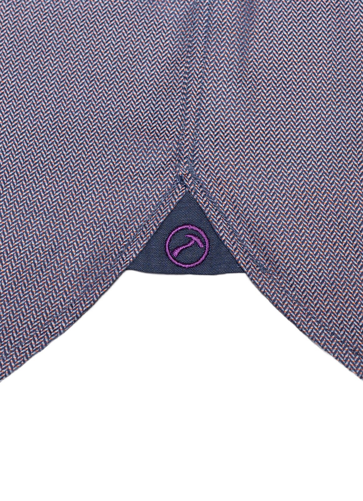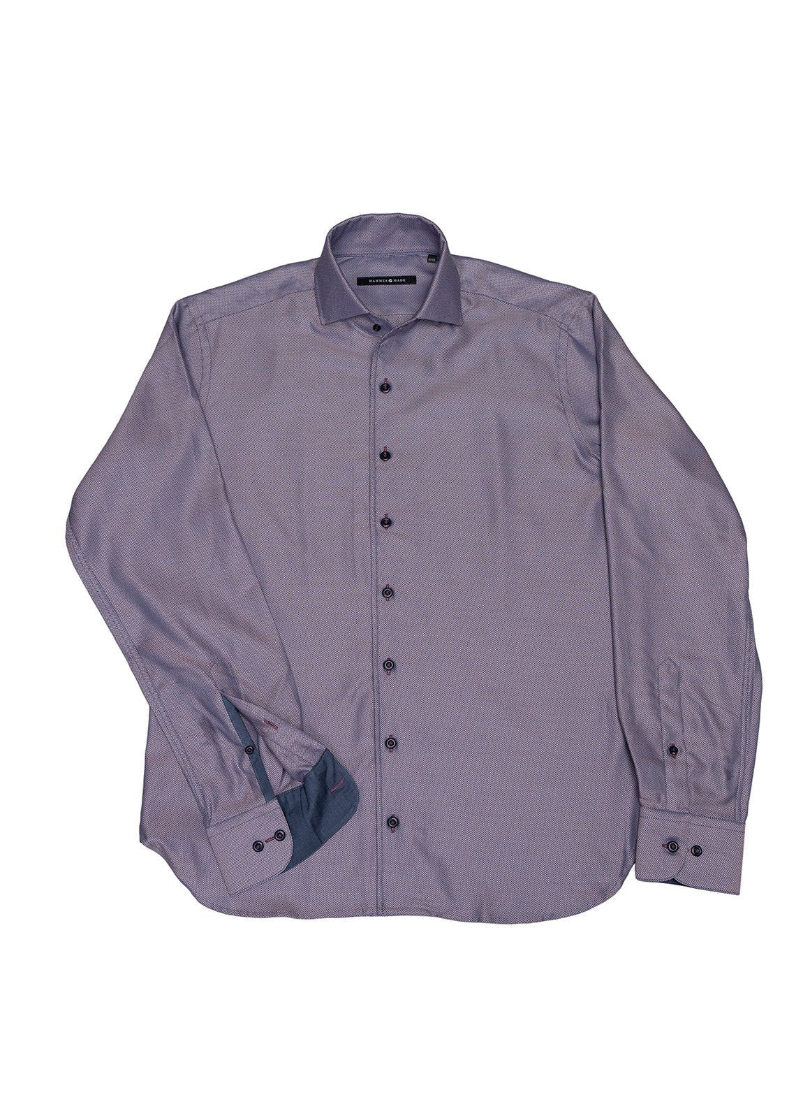 The Doyle dress shirt features a refined plum micro herringbone pattern with contrasting accents on the inner collar, cuff, and placket. Pictured the Doyle paired with the Dalton Sport Coat, ideal for professionals seeking a sharp, sophisticated look, this combination effortlessly blends modern detail with timeless elegance.
