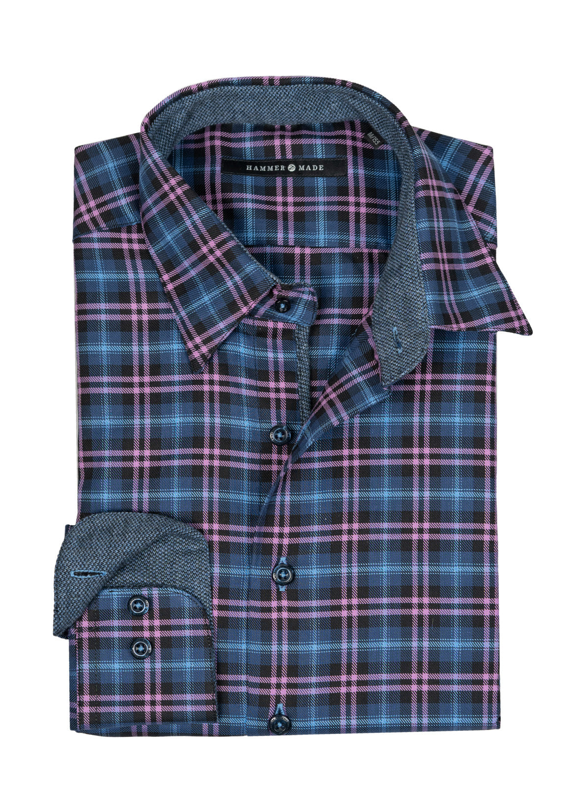 Meet the Larson—a shirt that's ready to have fun with its vibrant purple, blue, and navy plaid pattern that brings instant personality to your day. The playful blue contrast fabric peeking out from the inner cuff, collar, and placket adds those delightful surprise details that make getting dressed genuinely enjoyable. Pair it with your favorite jeans or dress it up; either way, this shirt keeps things light and lively.