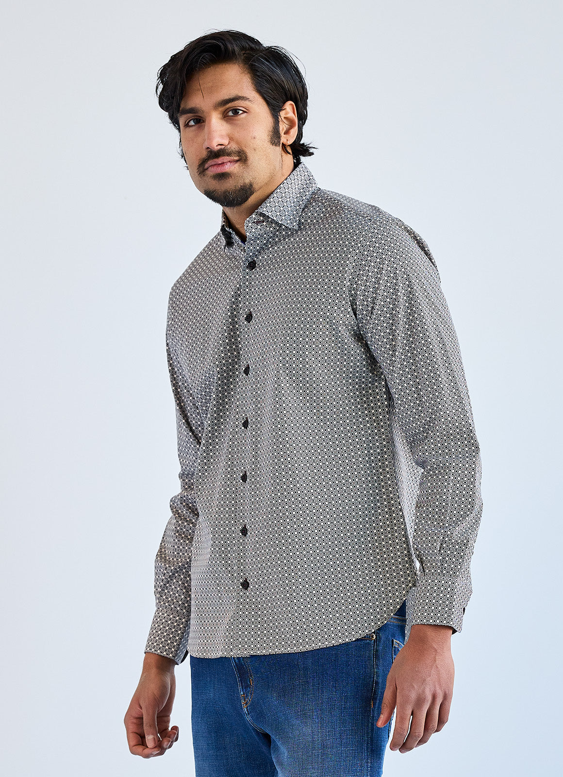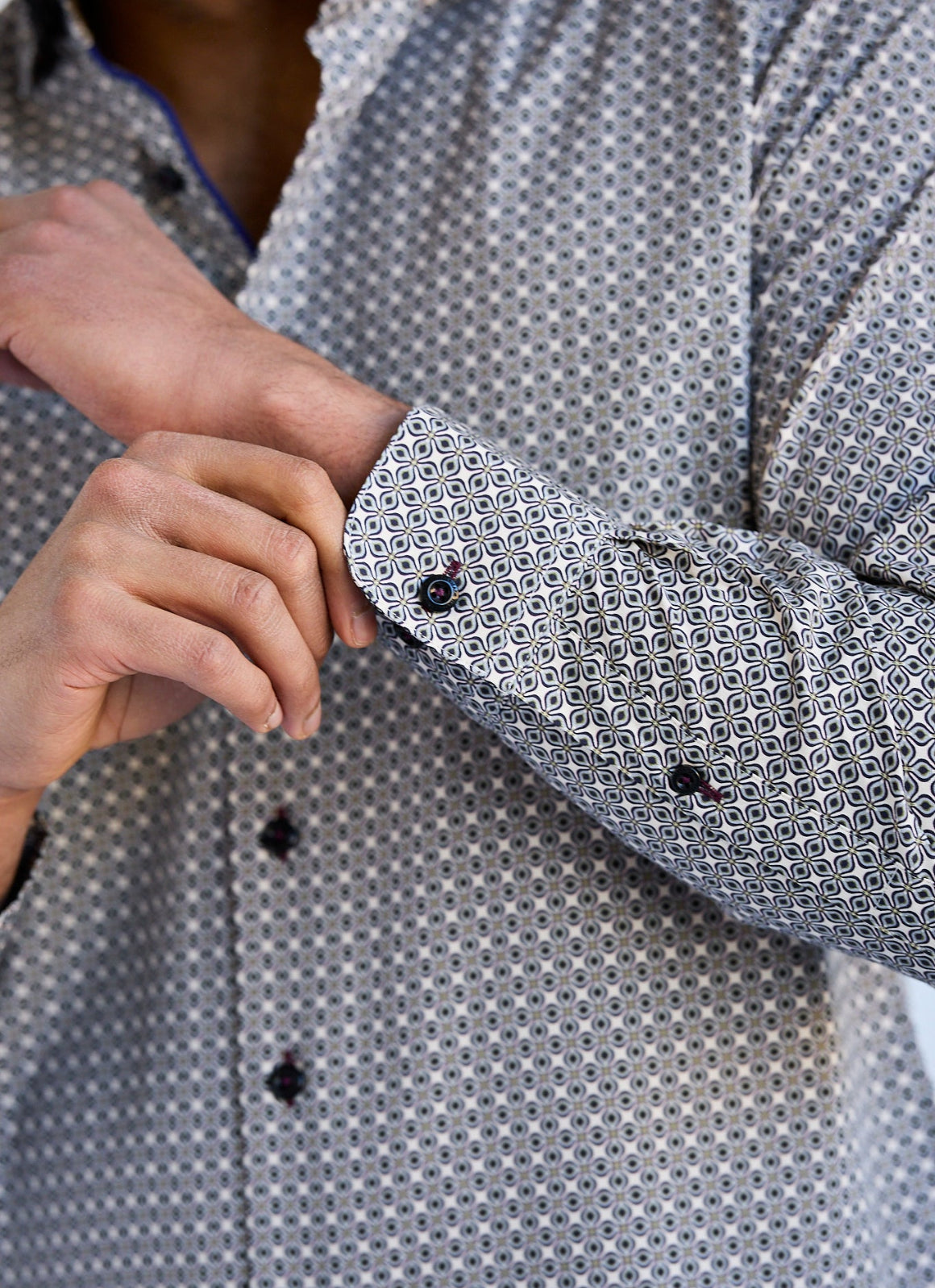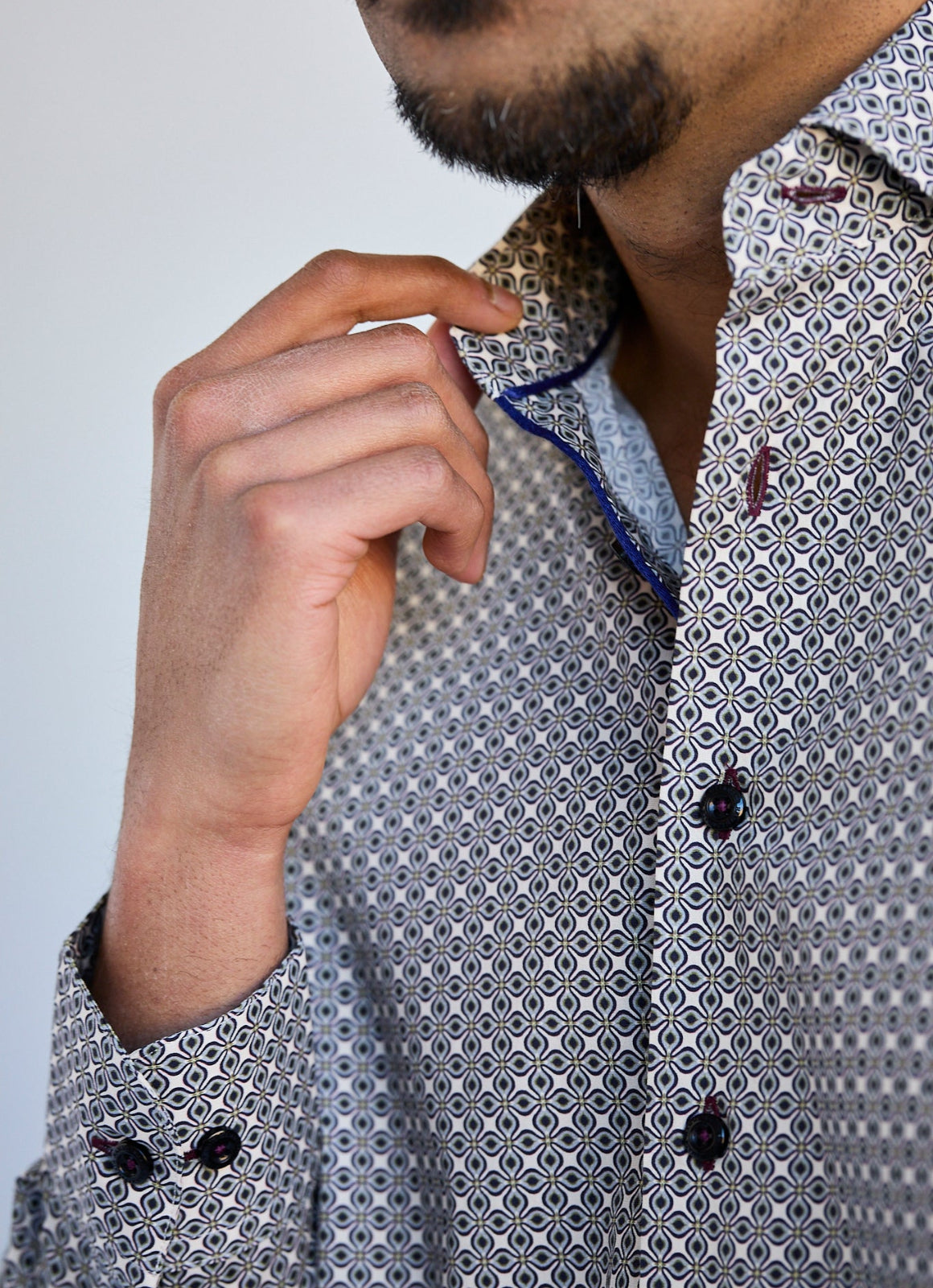 Discover the Schmetail, a European-crafted cotton shirt that combines timeless style with meticulous attention to detail. The sophisticated geometric pattern with blue piping detail around the collar and down the placket offers versatile elegance. With a comfortable give to the fabric, the Schmetail provides exceptional ease and unrestricted movement without compromising its polished aesthetic. Elevate your wardrobe with a shirt that balances classic design with distinctive European quality.