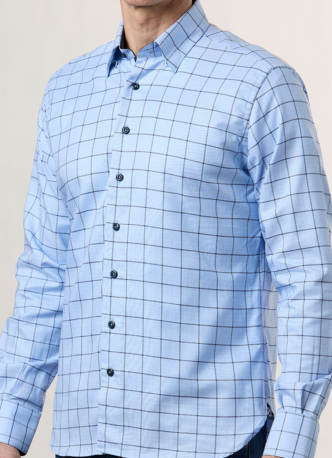 Transform your wardrobe with the Kloster, a sophisticated blue window pane check button down. Elevate your style with navy contrast details, adding a touch of elegance to your look. Step into a world of luxury with this exclusive piece, perfect for any occasion.