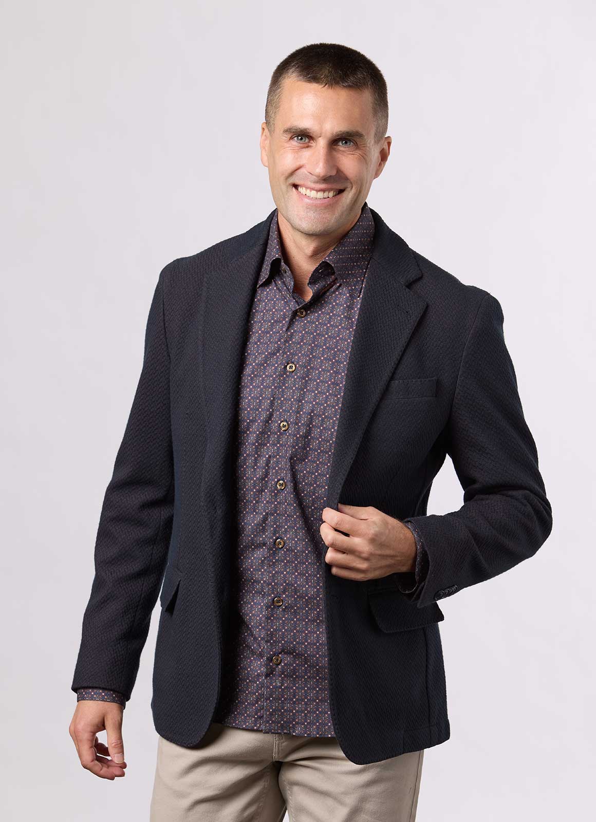 We make our sleeves slightly longer to showcase cuff detail — sleeves can be shortened by a tailor, but not lengthened.