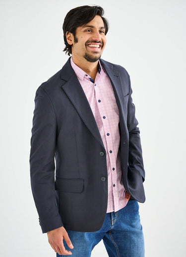 The Navy Aberdeen Stretch Sport Coat combines refined tailoring with modern performance. Expertly crafted, this blazer stretches and moves with you whether you're traveling or layering for the office. Thoughtful details include a floral-lined interior with blue piping accents, a dedicated phone pocket, and two additional pockets for everyday essentials. Designed for comfort without compromising polish, it's the versatile layer every wardrobe needs.
