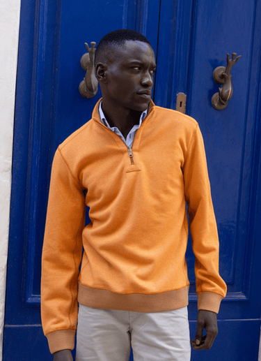 The Onamia Reversible Quarter Zip is crafted from premium European cotton, delivering a soft hand with a structured, elevated finish. Thoughtful details, contrast knit bands at the cuffs and hem, a refined zip collar, and a subtle logo on the inner and outer yoke add depth to its clean silhouette. The reversible design offers two distinct looks in one versatile piece, doubling your styling possibilities. Designed to layer seamlessly over a dress shirt, it moves effortlessly from the office to evening.