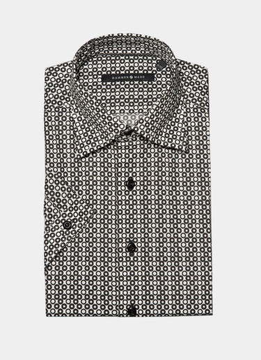 Take on new challenges with Fes! This bold black and white ring print short sleeve shirt will elevate your style and keep you comfortable while you conquer the day. Embrace your adventurous side and stand out in this unique piece.