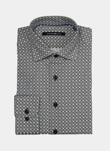 Discover the Schmetail, a European-crafted cotton shirt that combines timeless style with meticulous attention to detail. The sophisticated geometric pattern with blue piping detail around the collar and down the placket offers versatile elegance. With a comfortable give to the fabric, the Schmetail provides exceptional ease and unrestricted movement without compromising its polished aesthetic. Elevate your wardrobe with a shirt that balances classic design with distinctive European quality.