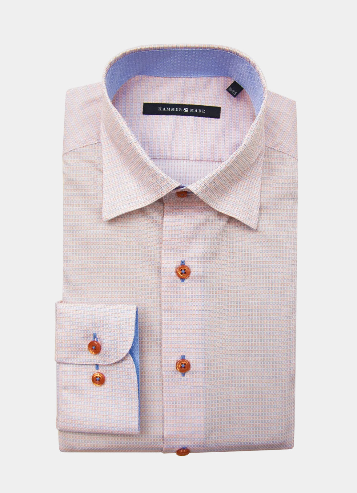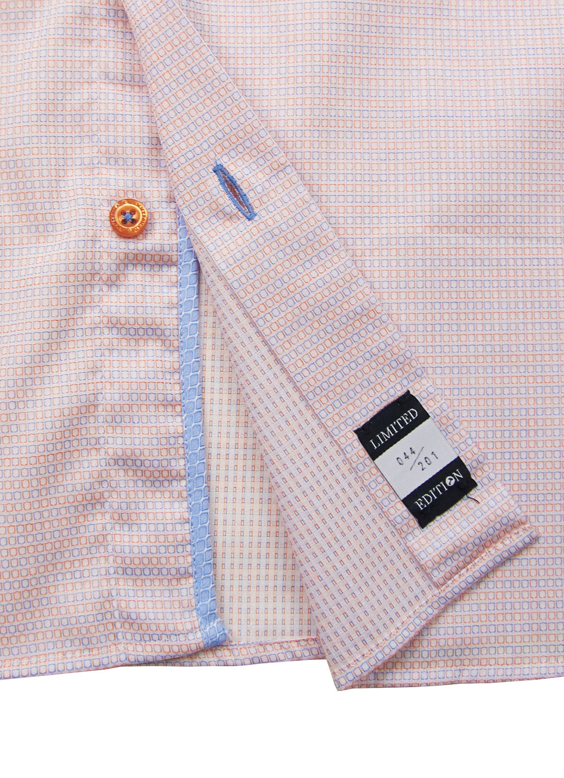 The Aurora is a light pink shirt crafted from premium European cotton, showcasing a subtle, delicate micropattern that embodies understated sophistication. Signature contrasting fabric accents the inner collar, cuff, and placket, adding refined detail to this versatile piece. Perfect for elevating everyday style with European-made quality and timeless elegance.