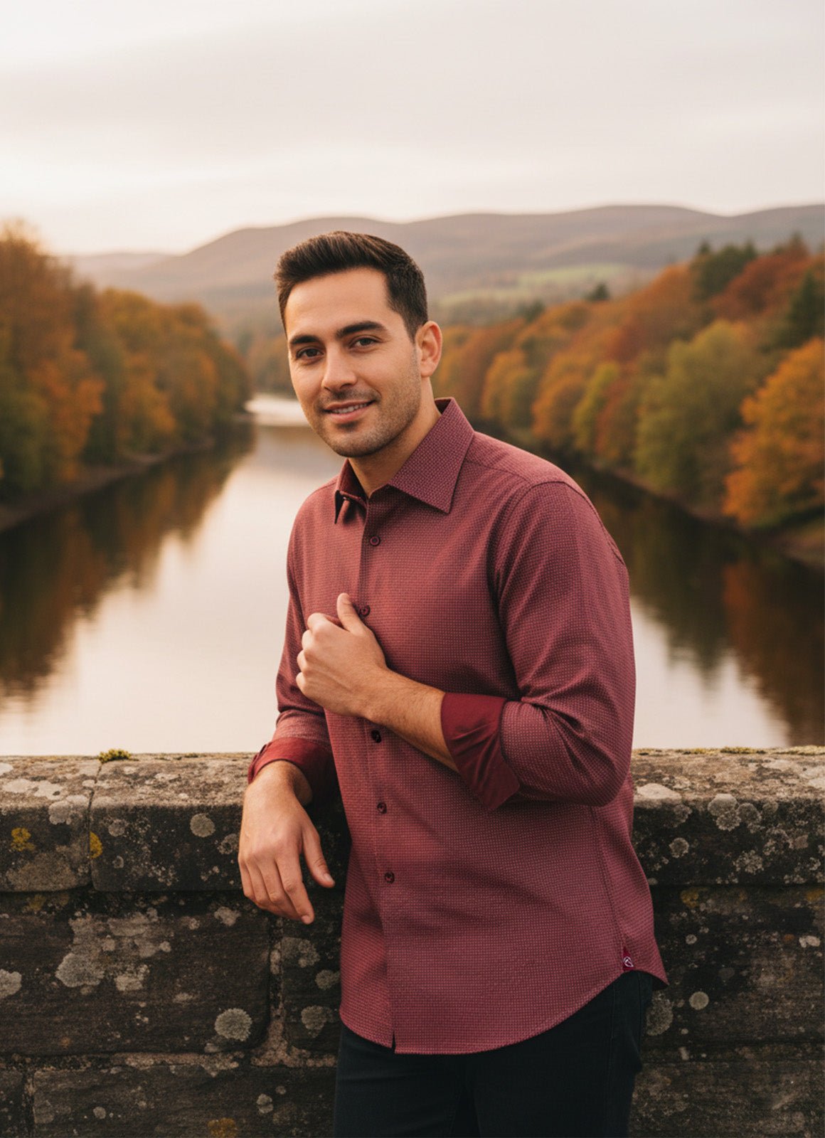 The Fulda combines style with everyday practicality. This festive burnt red piece features performance stretch fabric that moves with you, ensuring comfort throughout your day. The wrinkle-resistant finish means less time ironing and more time enjoying what matters. Whether you're heading to work or a special occasion, this versatile garment keeps you looking polished and feeling confident.