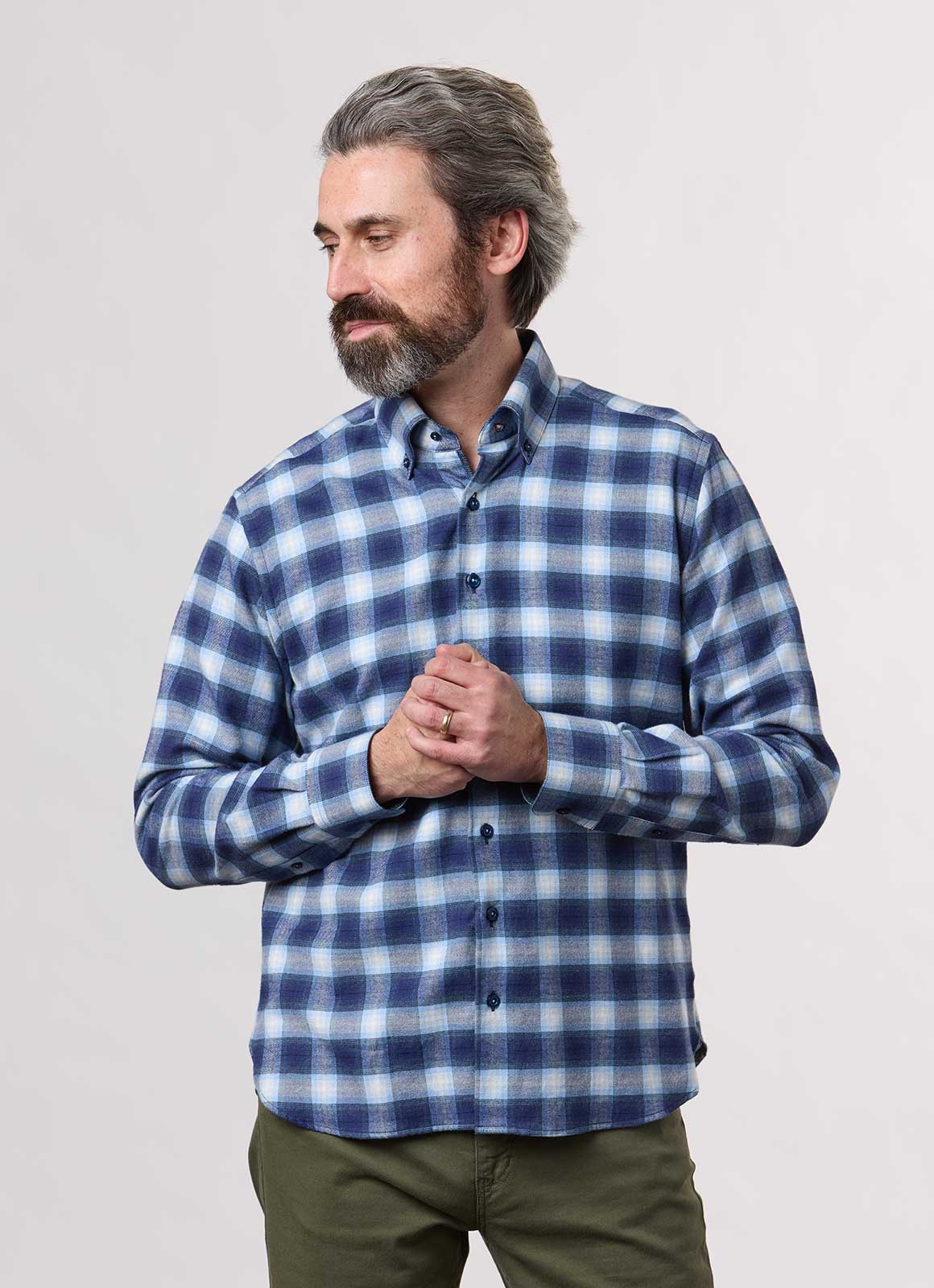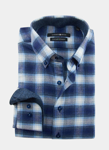 Introducing the Kimball button-down flannel, crafted with high-quality Italian flannel. The stunning blue plaid design is complemented by blue contrast fabric, adding a touch of sophistication. Italian Fabric