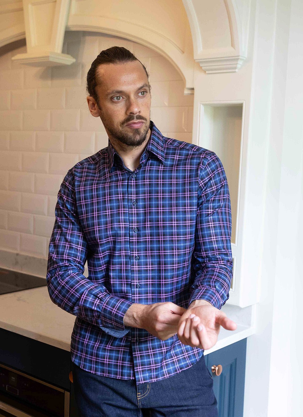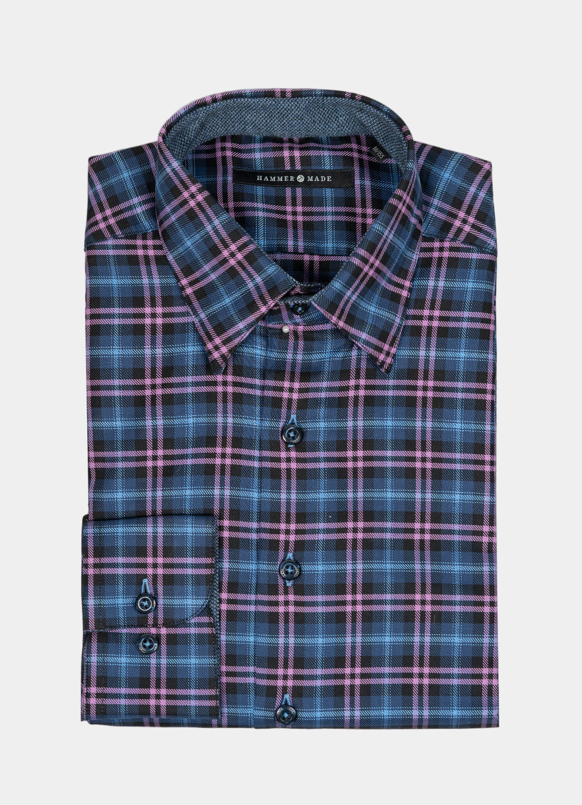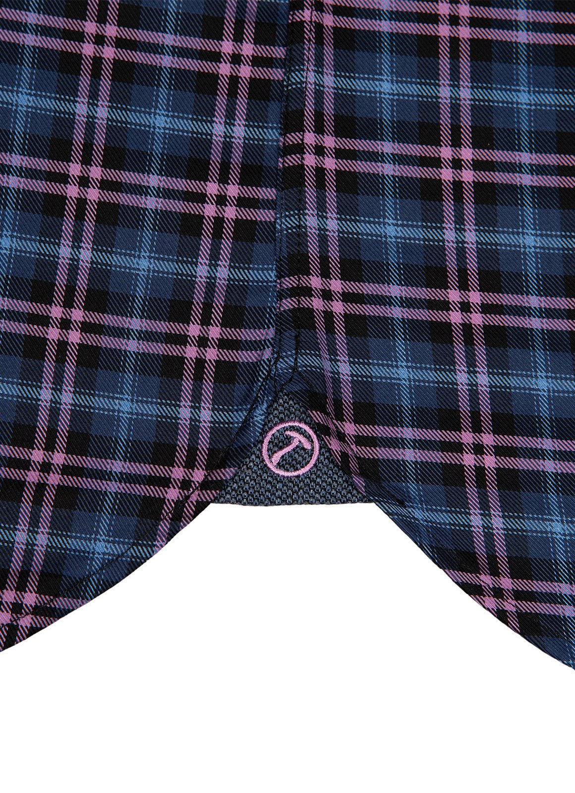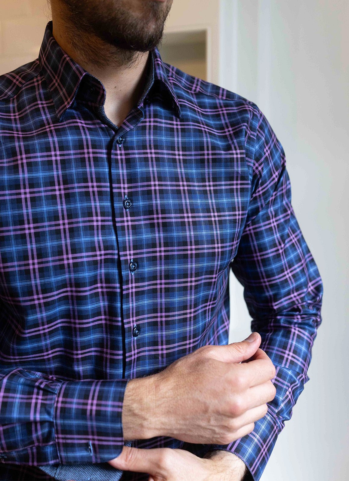 Meet the Larson—a shirt that's ready to have fun with its vibrant purple, blue, and navy plaid pattern that brings instant personality to your day. The playful blue contrast fabric peeking out from the inner cuff, collar, and placket adds those delightful surprise details that make getting dressed genuinely enjoyable. Pair it with your favorite jeans or dress it up; either way, this shirt keeps things light and lively.