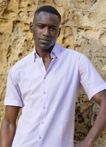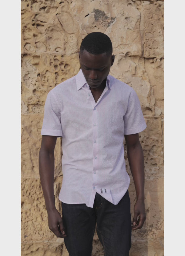 Meet the Micah, a short sleeve button down in a white and pink stripe seersucker texture with an calm light blue fabric on the inner collar, under sleeve cuff, and gusset for refined detail. Crafted from premium European cotton offering breathable comfort for the warmer seasons, the textured seersucker weave provides natural ventilation while the thoughtful pattern placement adds visual interest without overwhelming the classic silhouette. This versatile piece transitions seamlessly from casual weekend wear to smart-casual office settings.