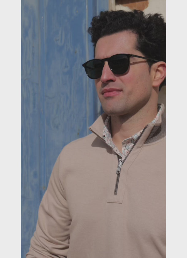 The Onamia Reversible Quarter Zip is crafted from premium European cotton, delivering a soft hand with a structured, elevated finish. Thoughtful details, contrast knit bands at the cuffs and hem, a refined zip collar, and a subtle logo on the inner and outer yoke add depth to its clean silhouette. The reversible design offers two distinct looks in one versatile piece, doubling your styling possibilities. Designed to layer seamlessly over a dress shirt, it moves effortlessly from the office to evening.