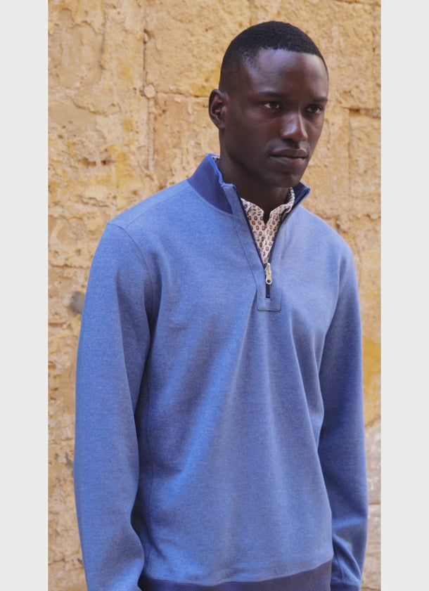 The Onamia Reversible Quarter Zip is crafted from premium European cotton, delivering a soft hand with a structured, elevated finish. Thoughtful details, contrast knit bands at the cuffs and hem, a refined zip collar, and a subtle logo on the inner and outer yoke add depth to its clean silhouette. The reversible design offers two distinct looks in one versatile piece, doubling your styling possibilities. Designed to layer seamlessly over a dress shirt, it moves effortlessly from the office to evening.