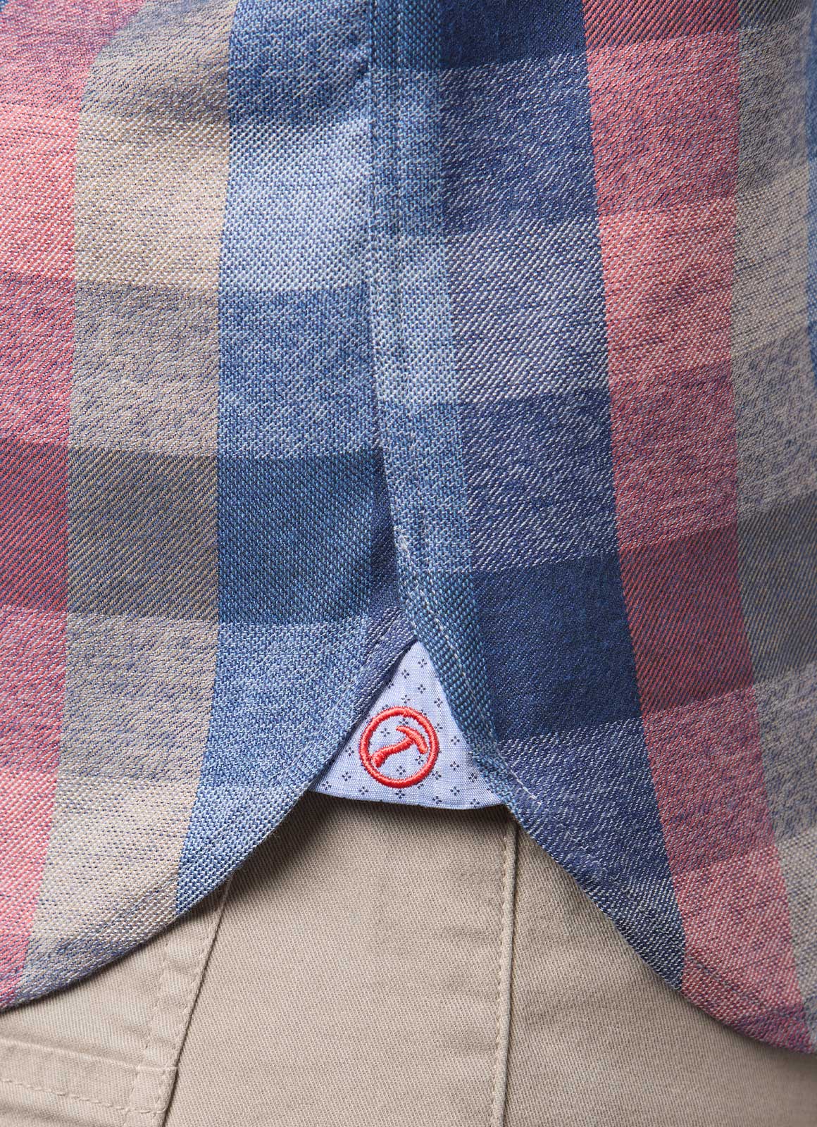 Introducing the Pettis button down shirt from Hammer Made. Made with a classic plaid design in shades of navy, coral, and tan, and featuring a light blue contrast fabric, this shirt offers timeless style and versatile wear for any occasion.